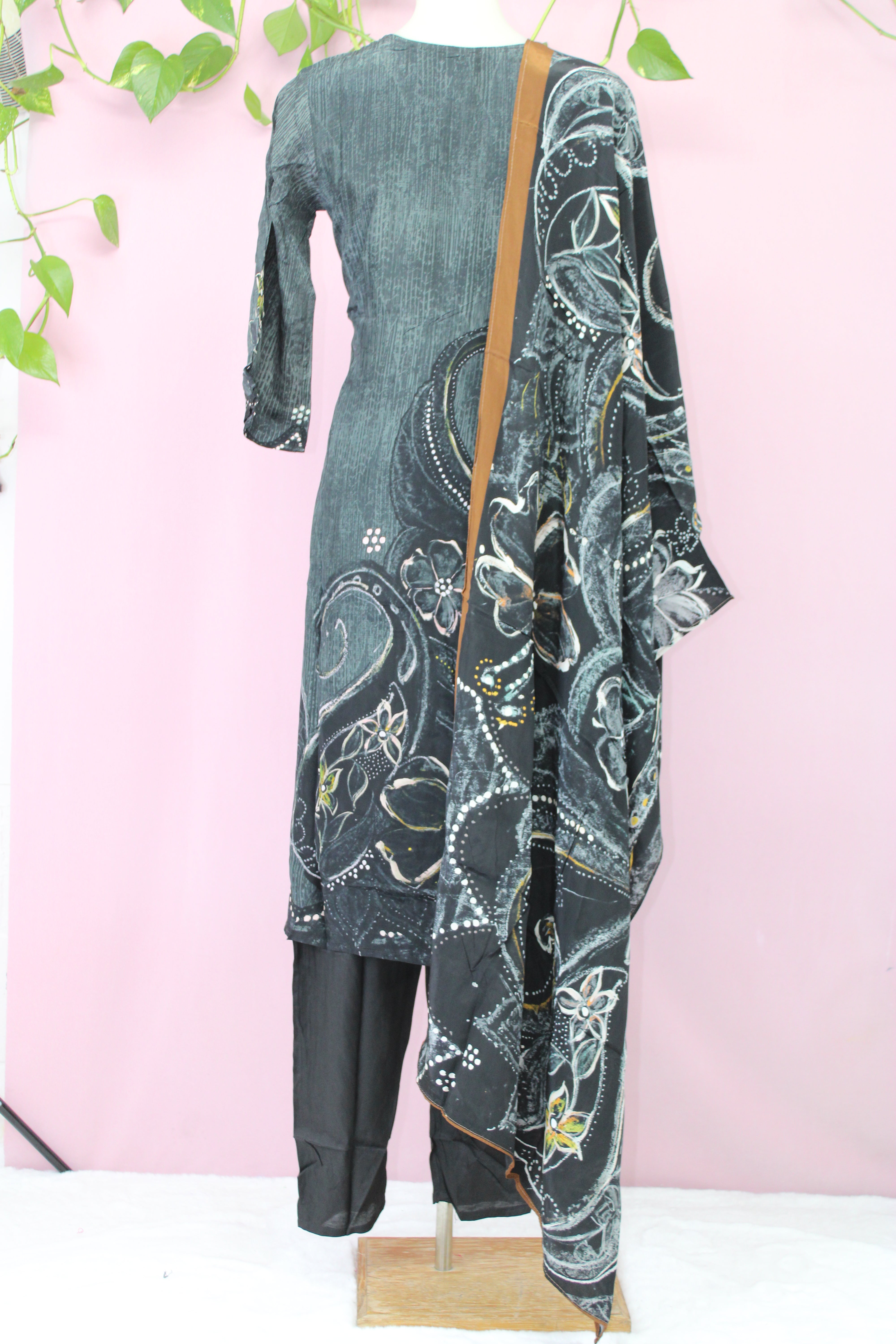 The flare is beautifully enhanced with strategic placement digital prints, creating visual balance and artistic appeal. Paired with a digitally printed crape dupatta and matching crape pants, this set blends contemporary elegance with timeless ethnic style.