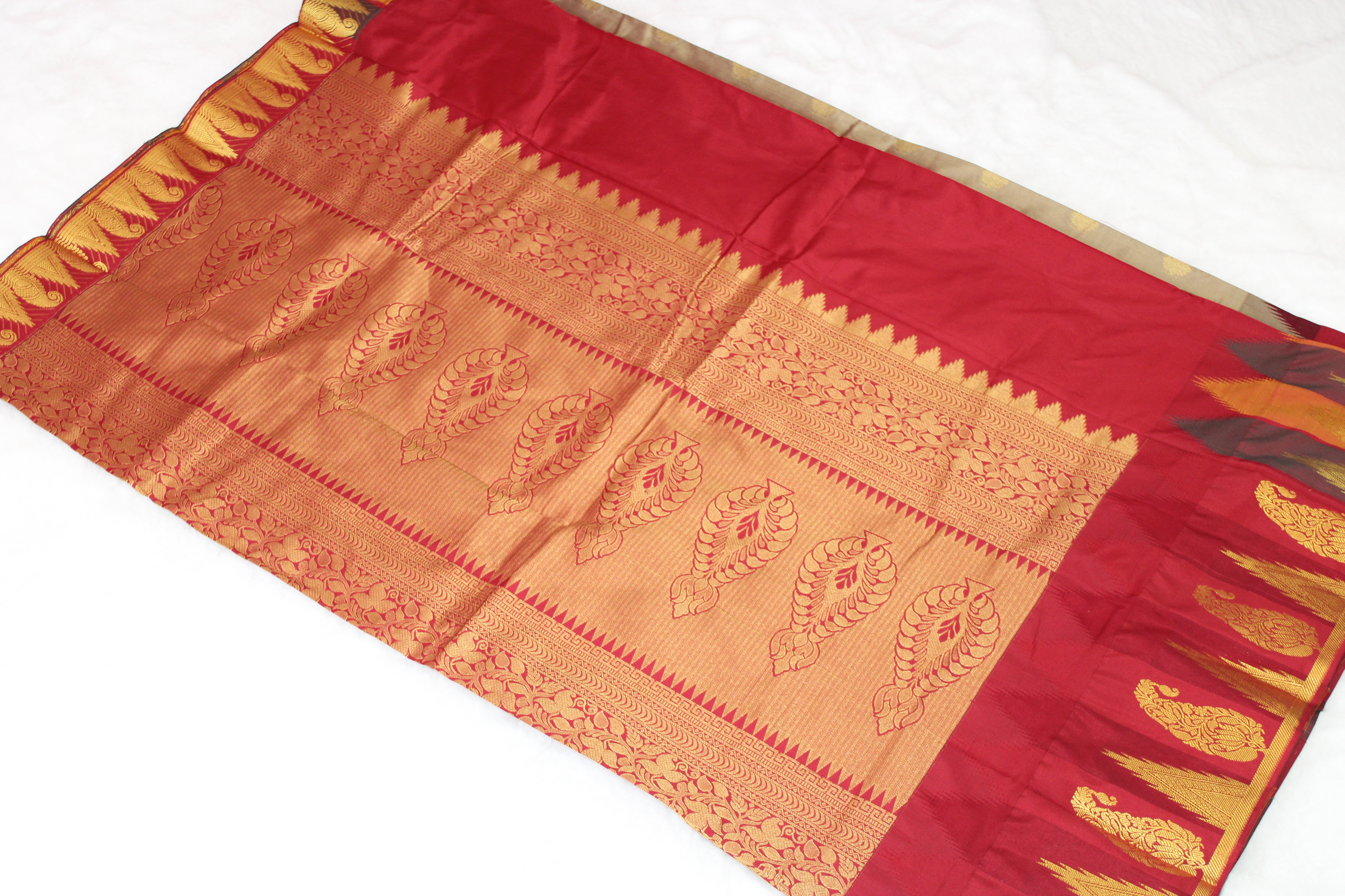 Traditional elegance takes center stage with this stunning saree, featuring a contrast temple jari border that adds a touch of heritage charm. The contrast pallu is richly adorned with detailed jari weaving, enhancing the overall look with intricate craftsmanship and visual depth.