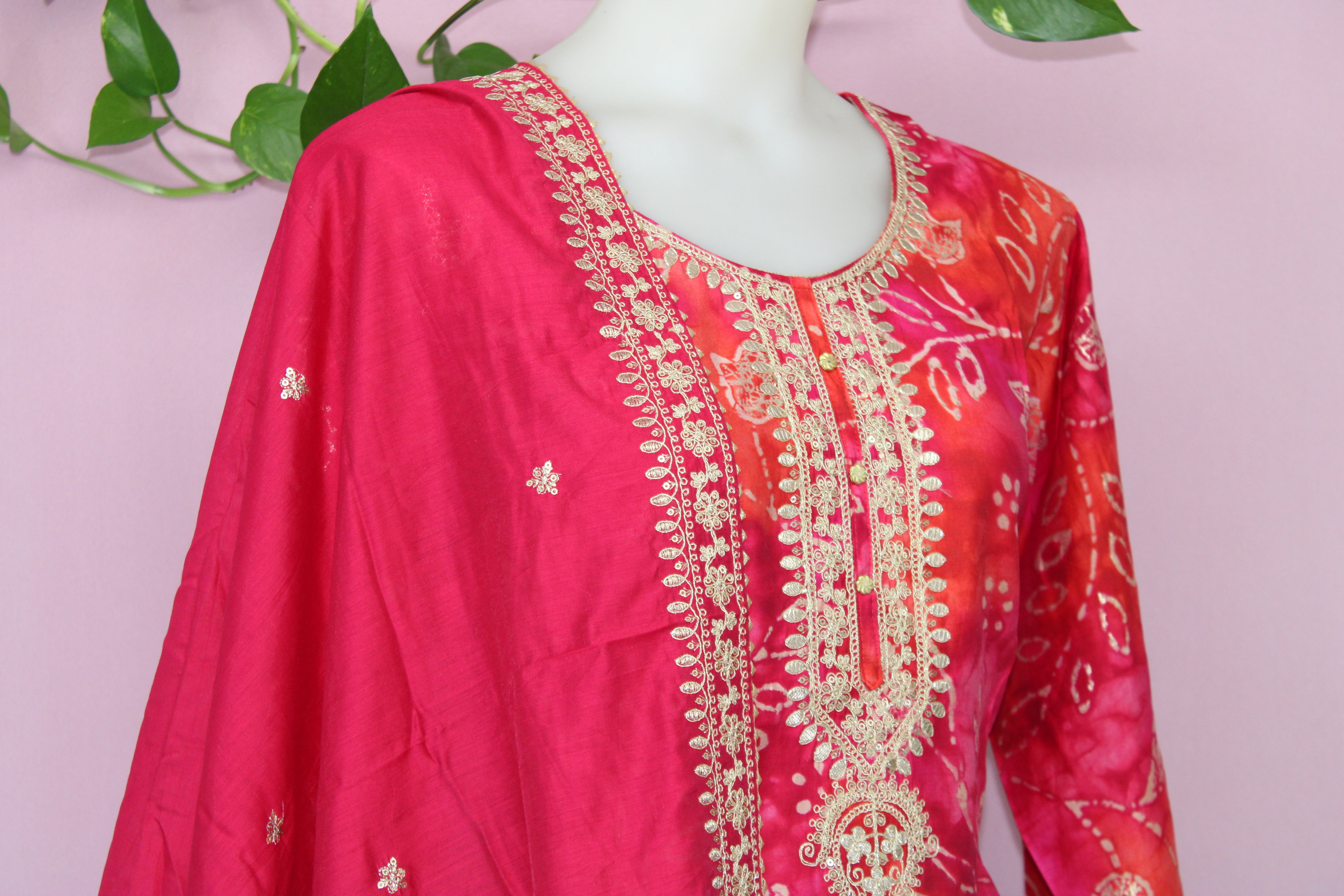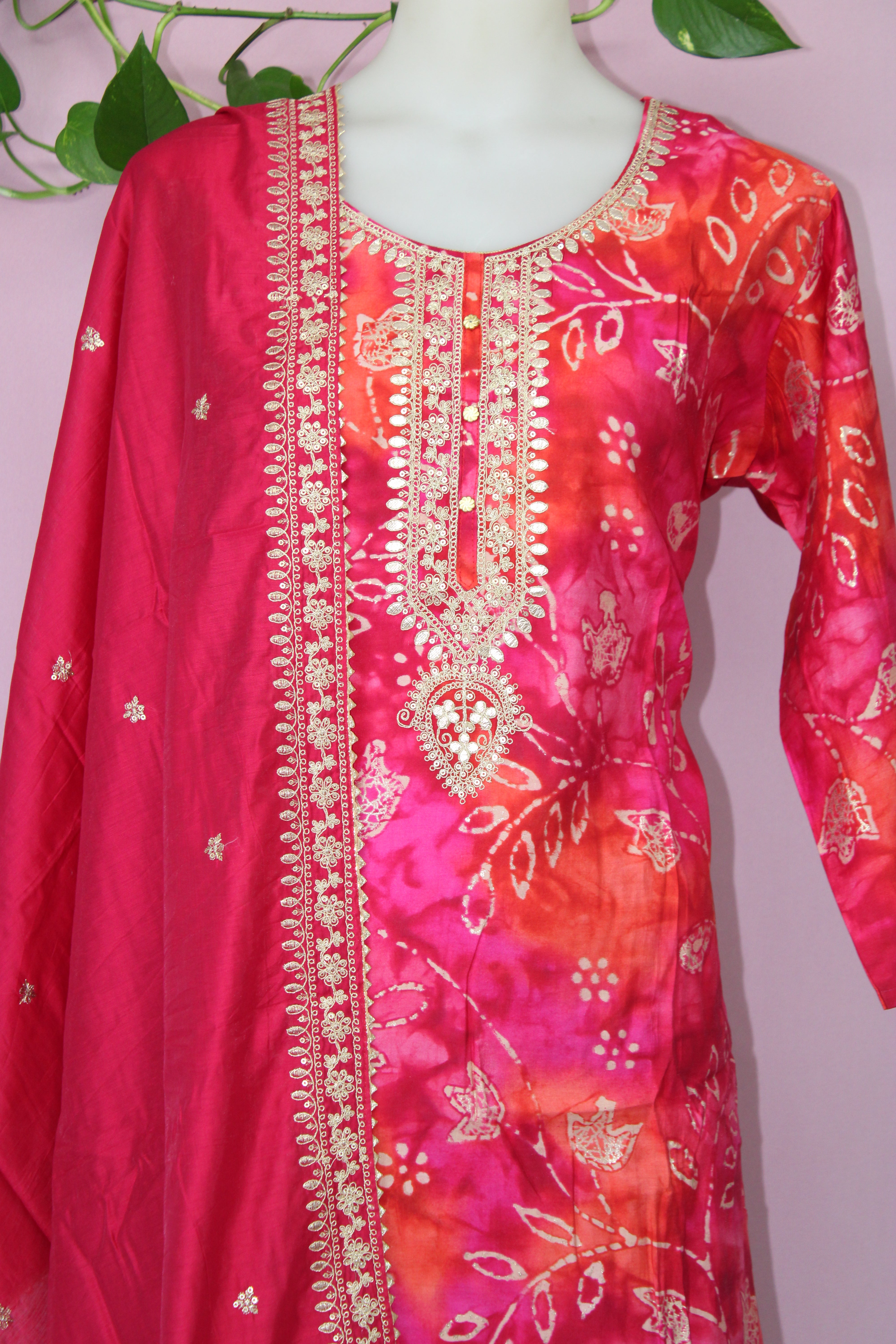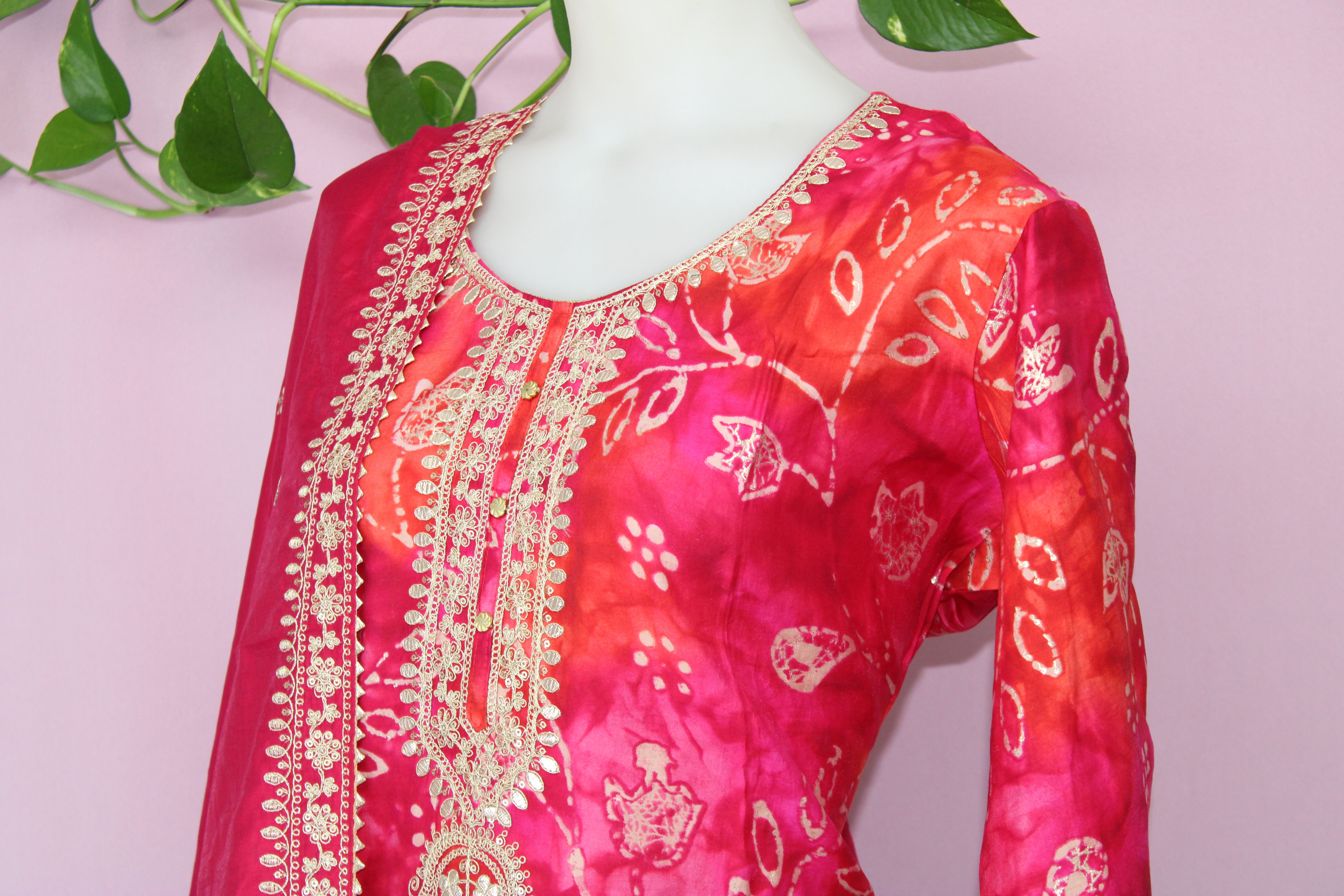 The kurta features a timeless batik print, enhanced with delicate embroidery along the neck and kurta patti, creating a subtle yet striking focal point. Gota patti work adds a traditional sparkle, while buttons on the patti lend a refined finish to the overall design.