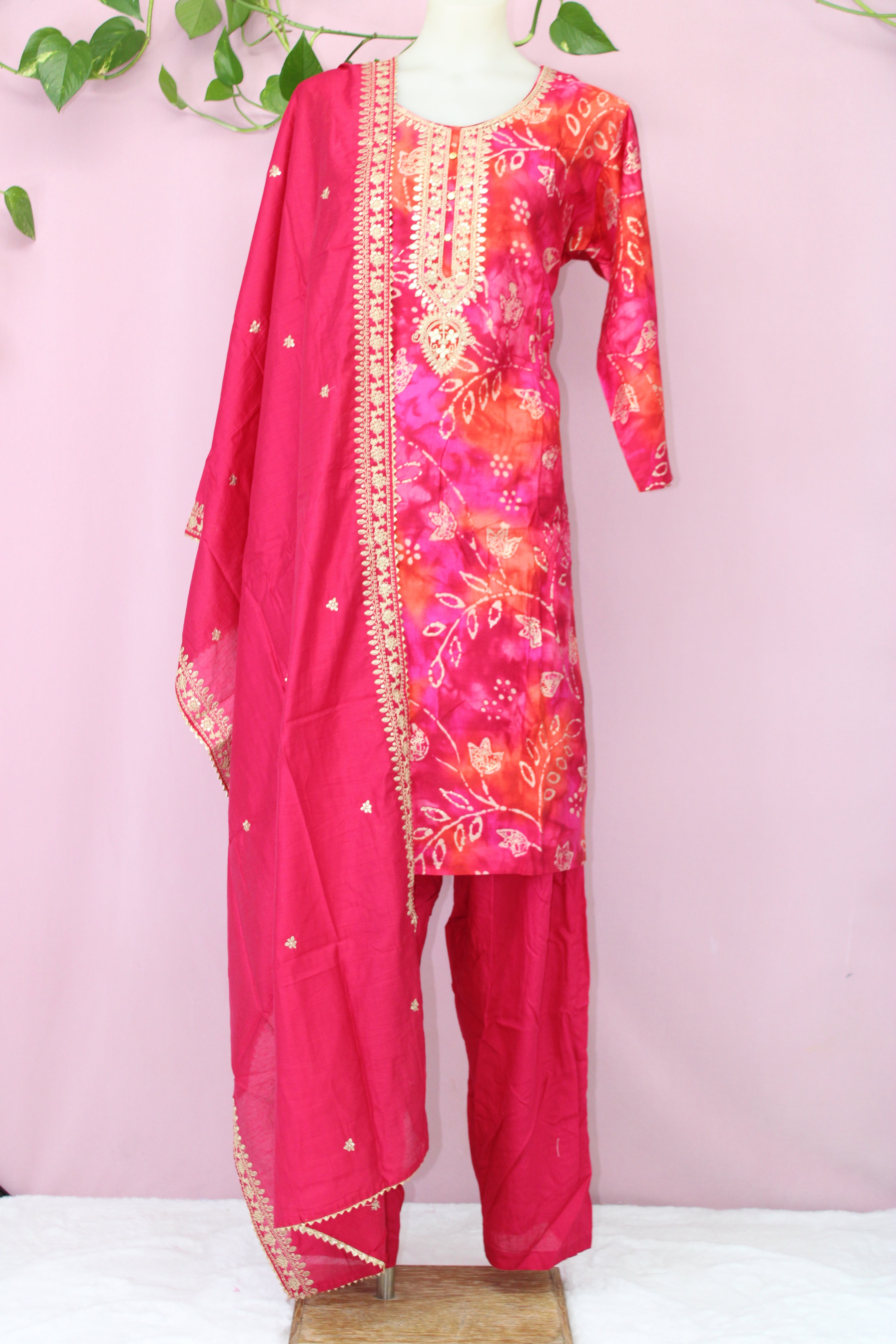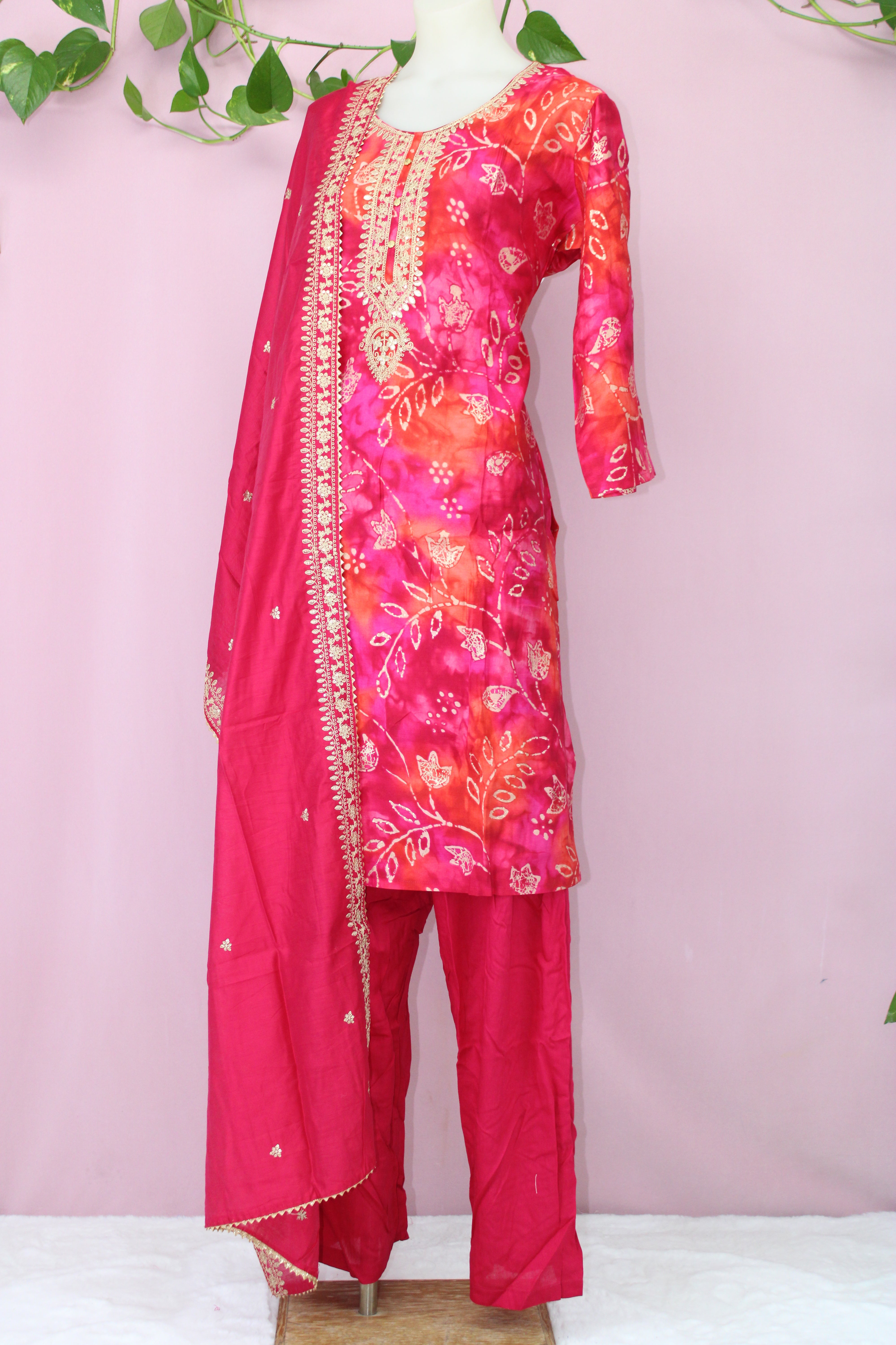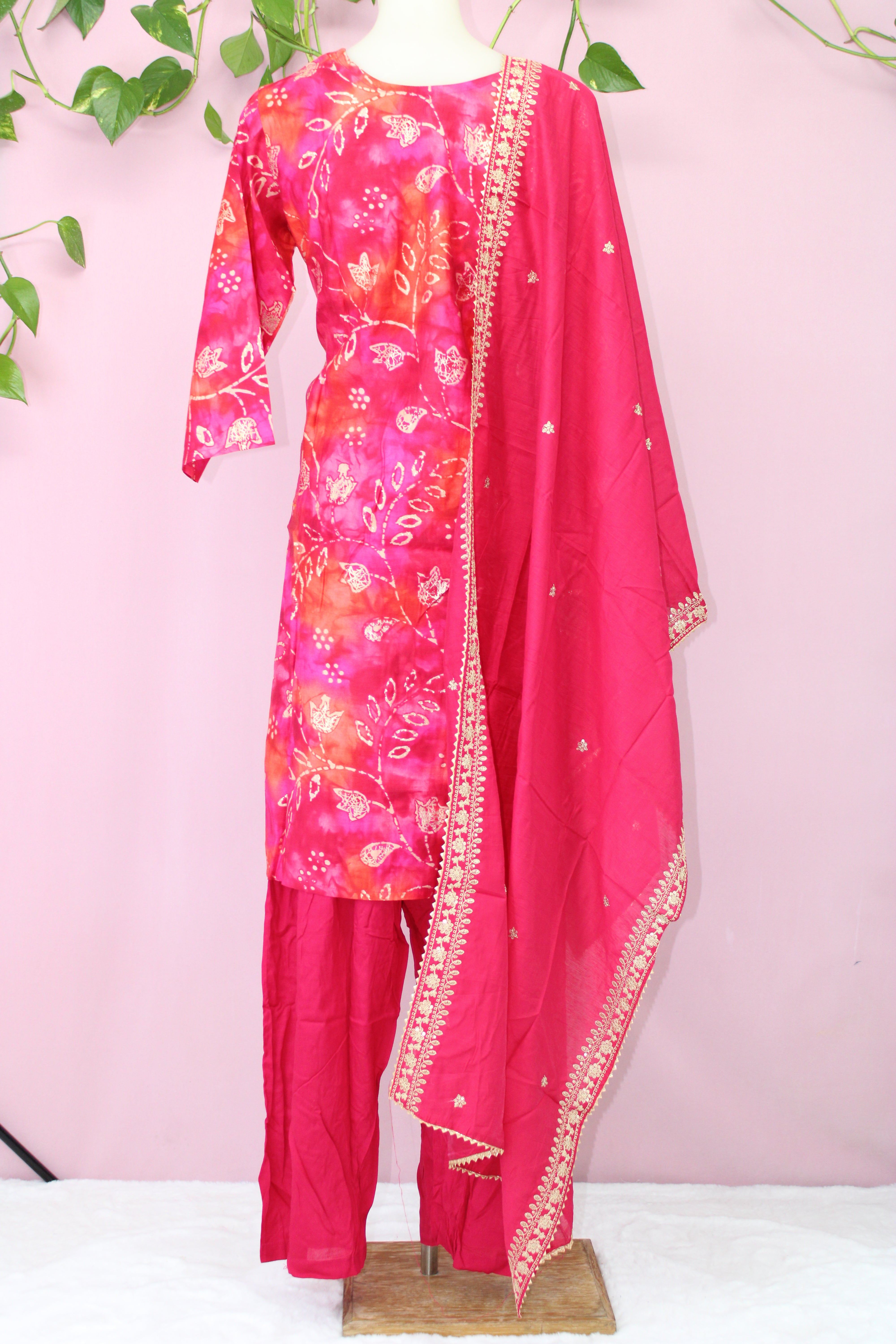 The kurta features a timeless batik print, enhanced with delicate embroidery along the neck and kurta patti, creating a subtle yet striking focal point. Gota patti work adds a traditional sparkle, while buttons on the patti lend a refined finish to the overall design.
