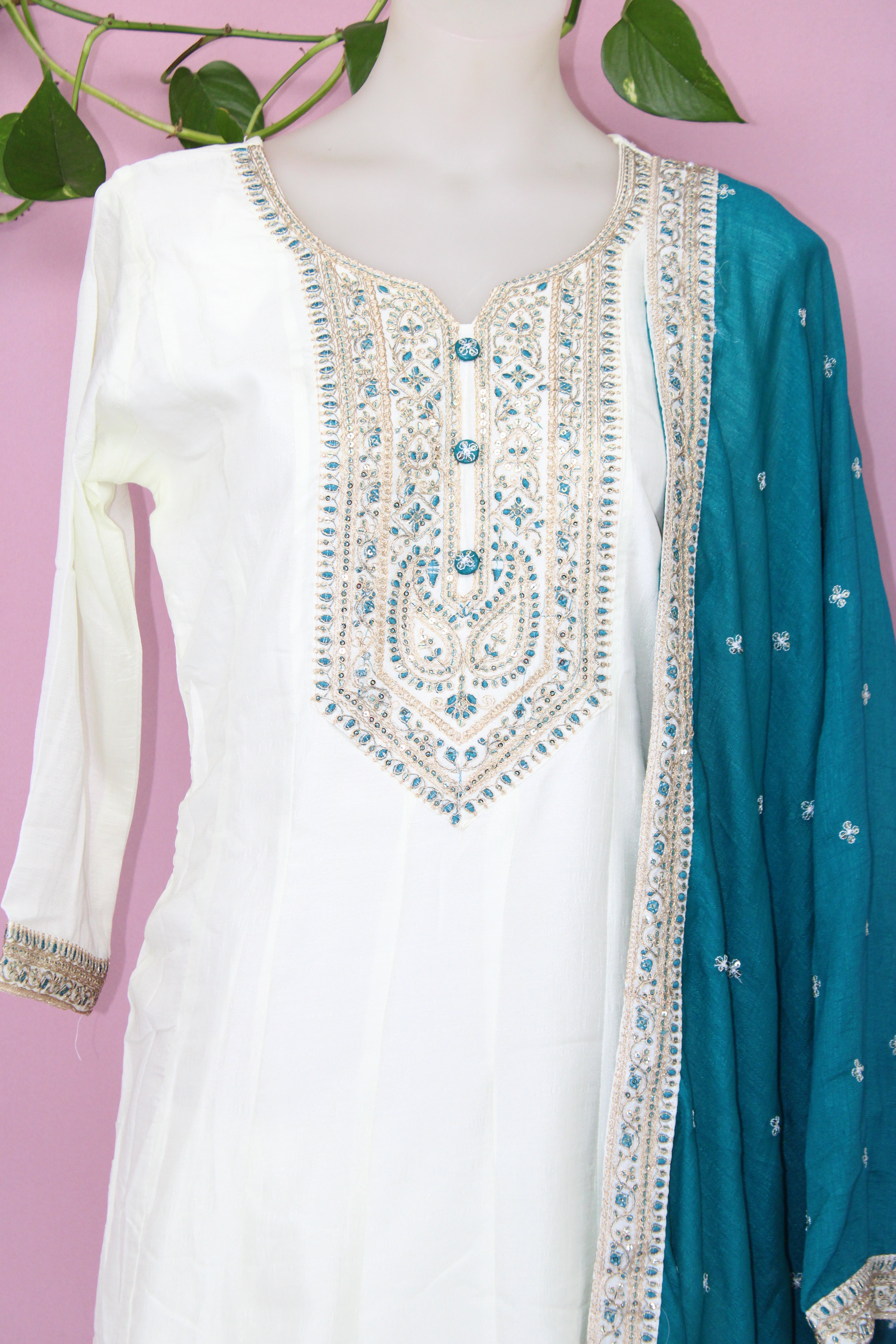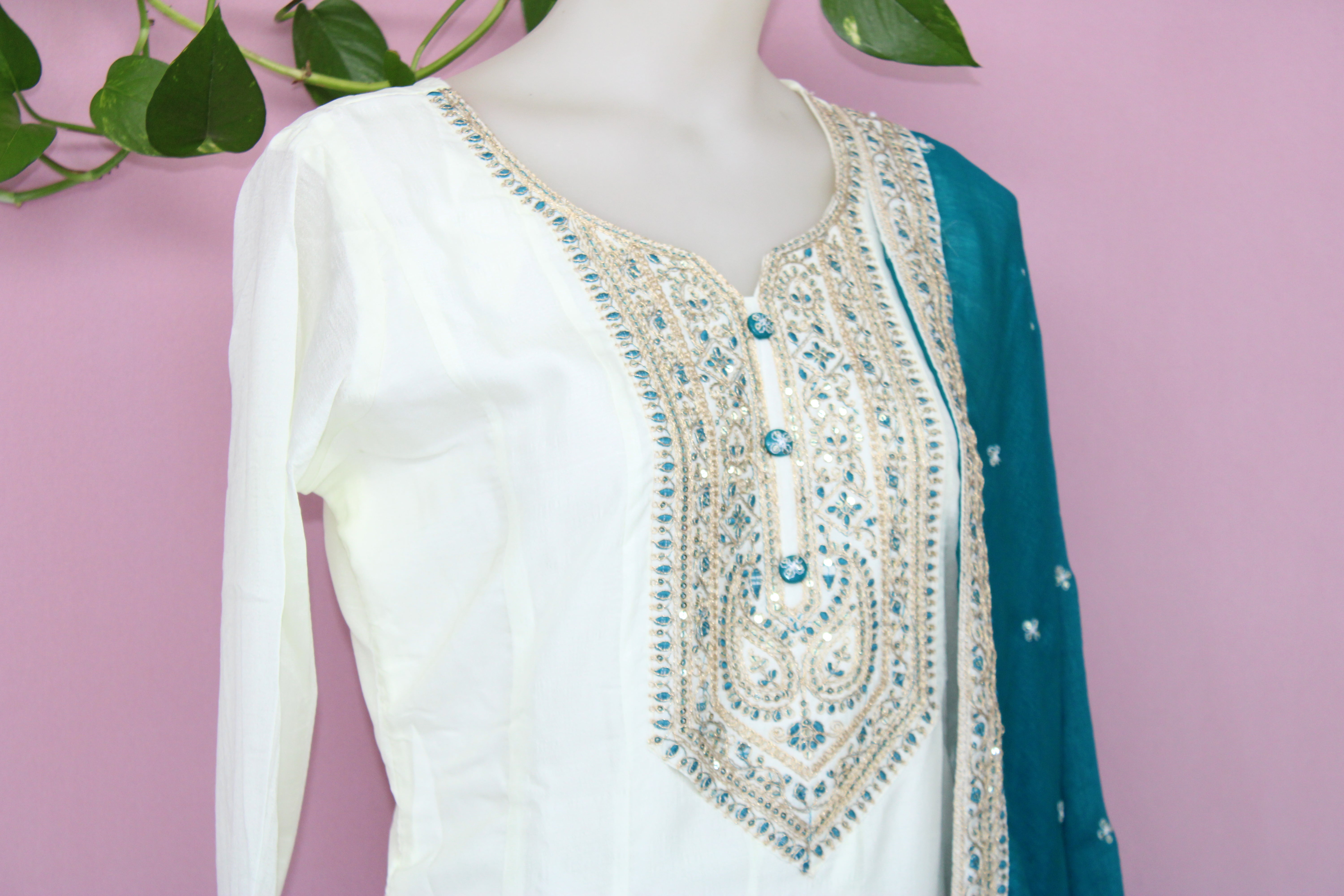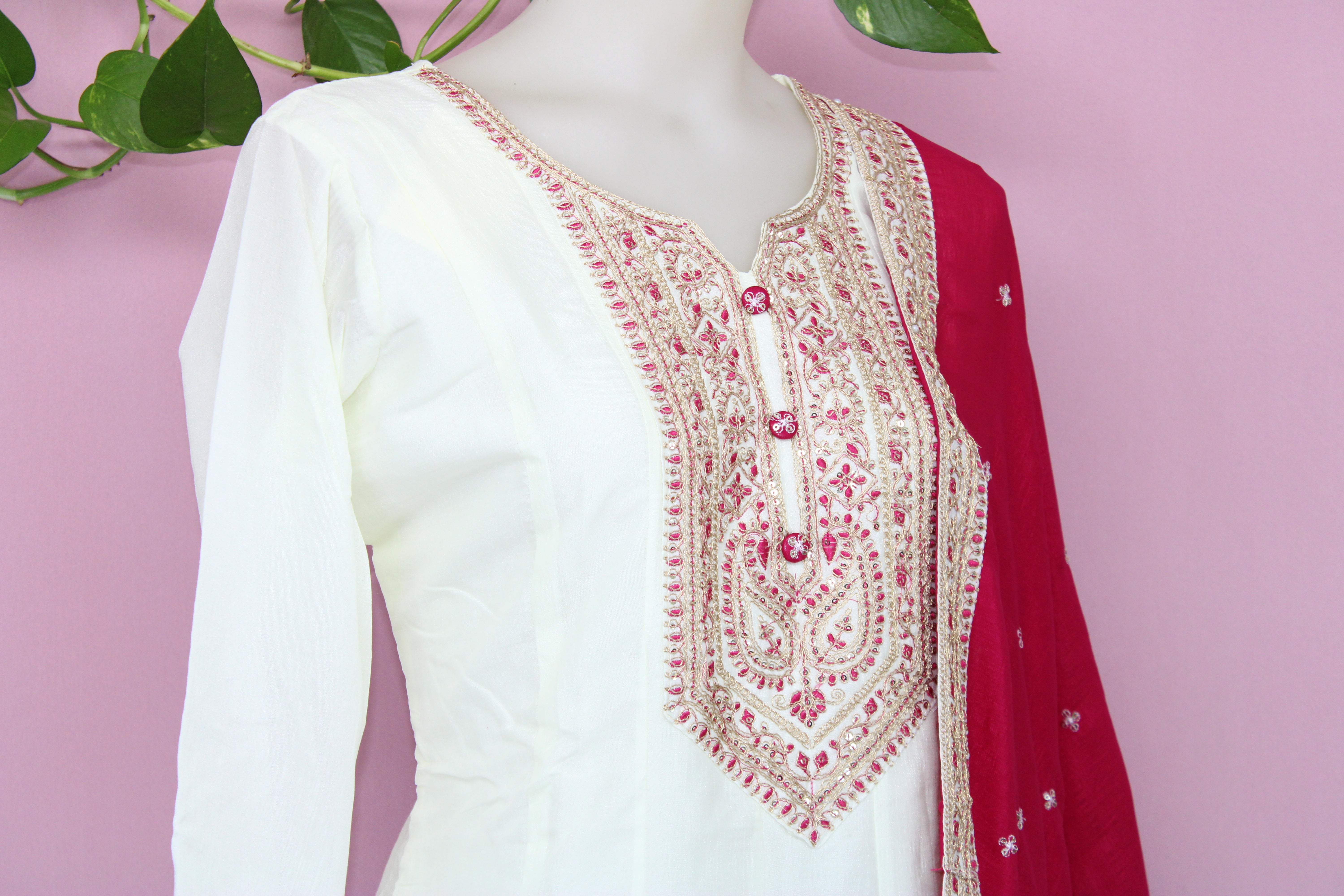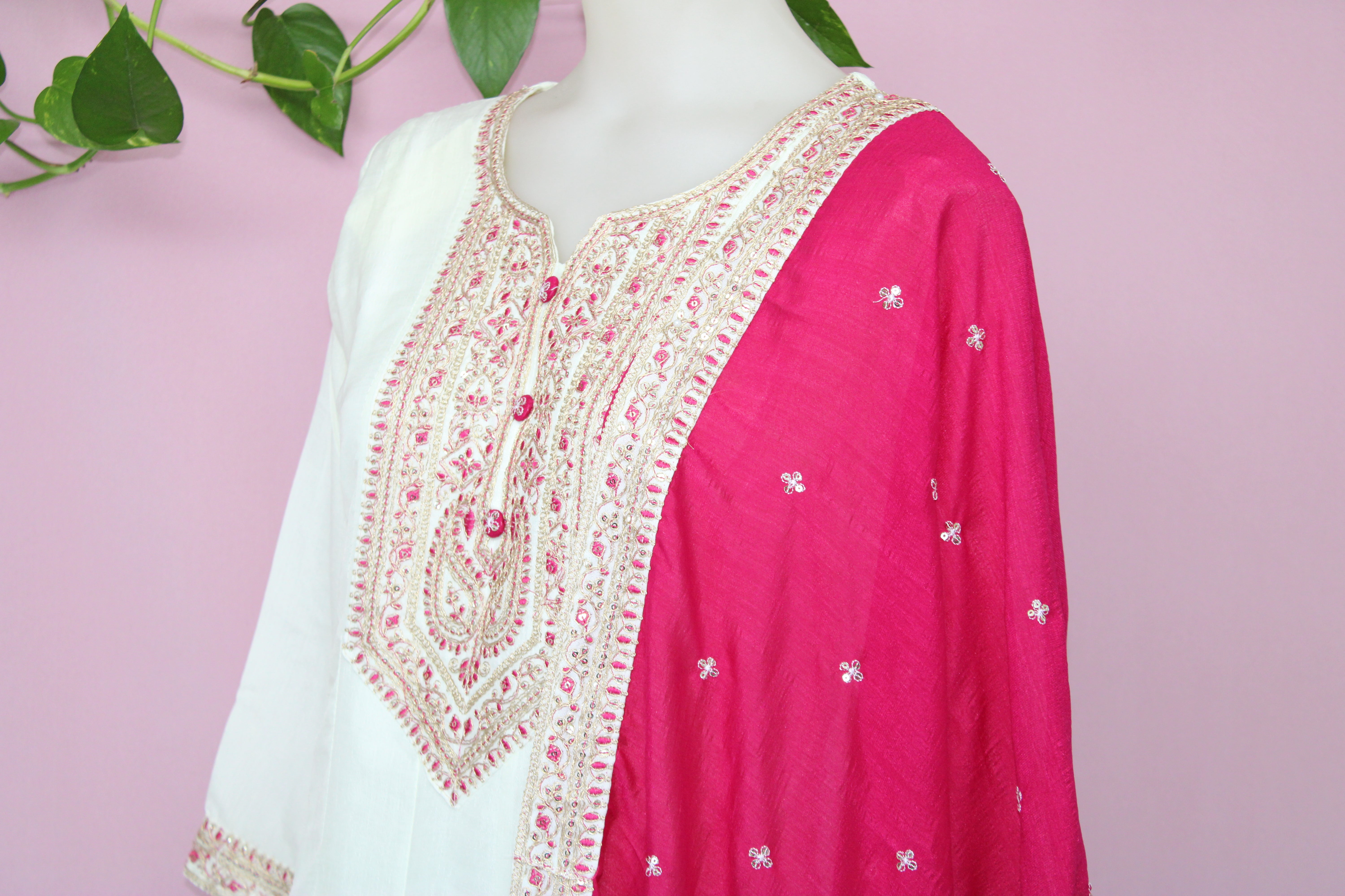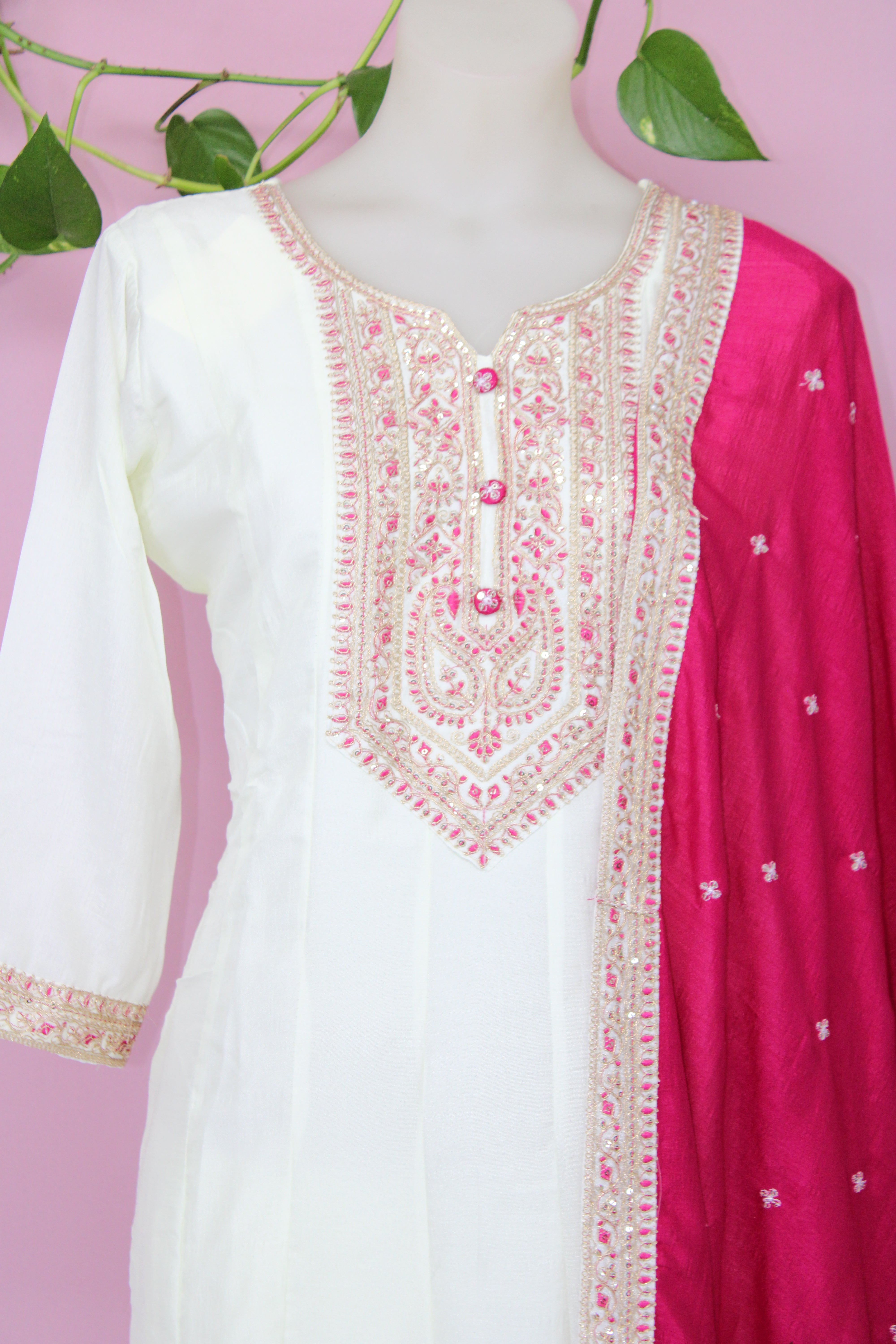 The kurta is fully lined for comfort and structure, finished with embroidered buttons on the kurta patti for refined detail. A matching Vichitra dupatta with a delicate four-side border complements the look, while the coordinated pants are accented with a subtle border at the hem, adding a polished finish.