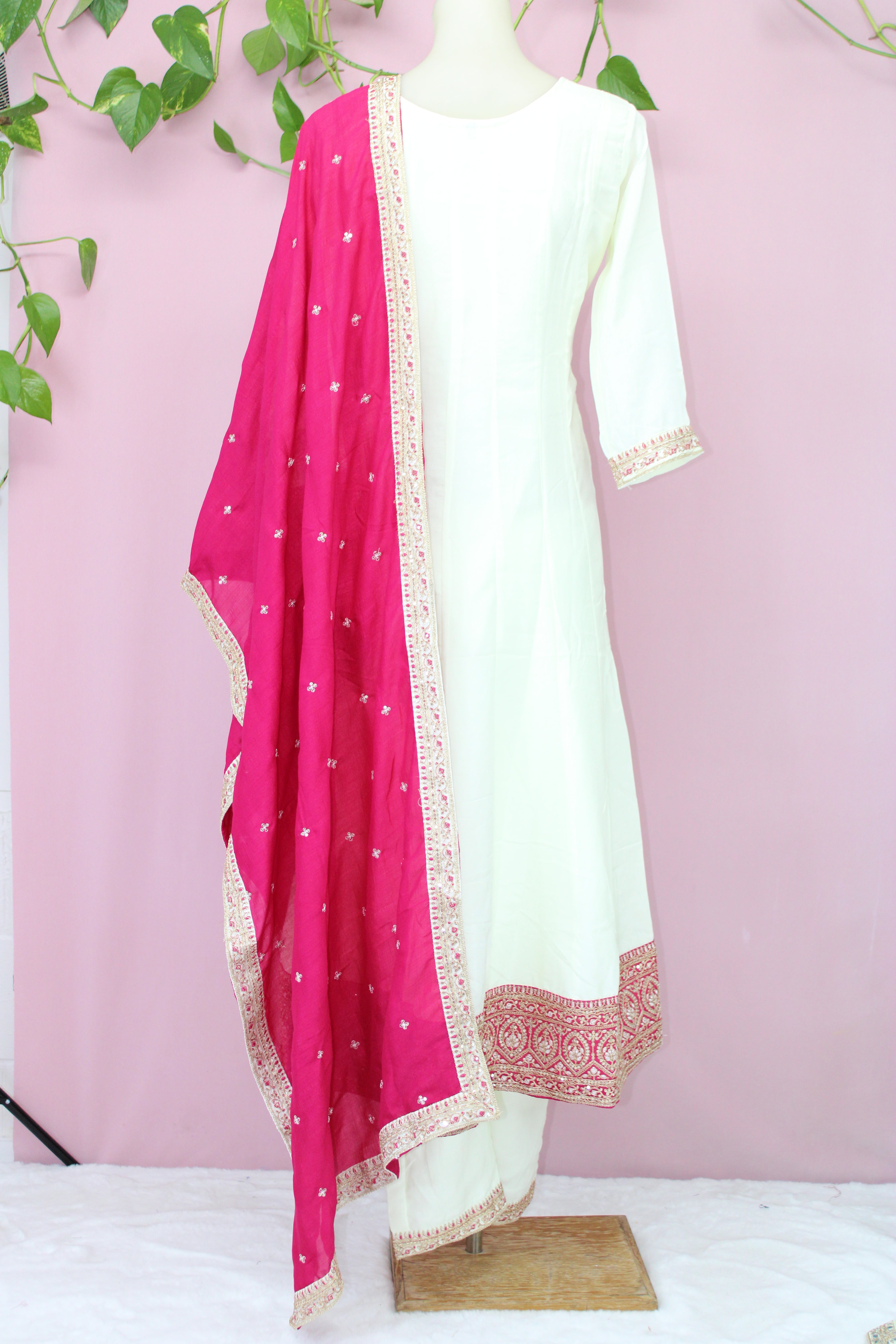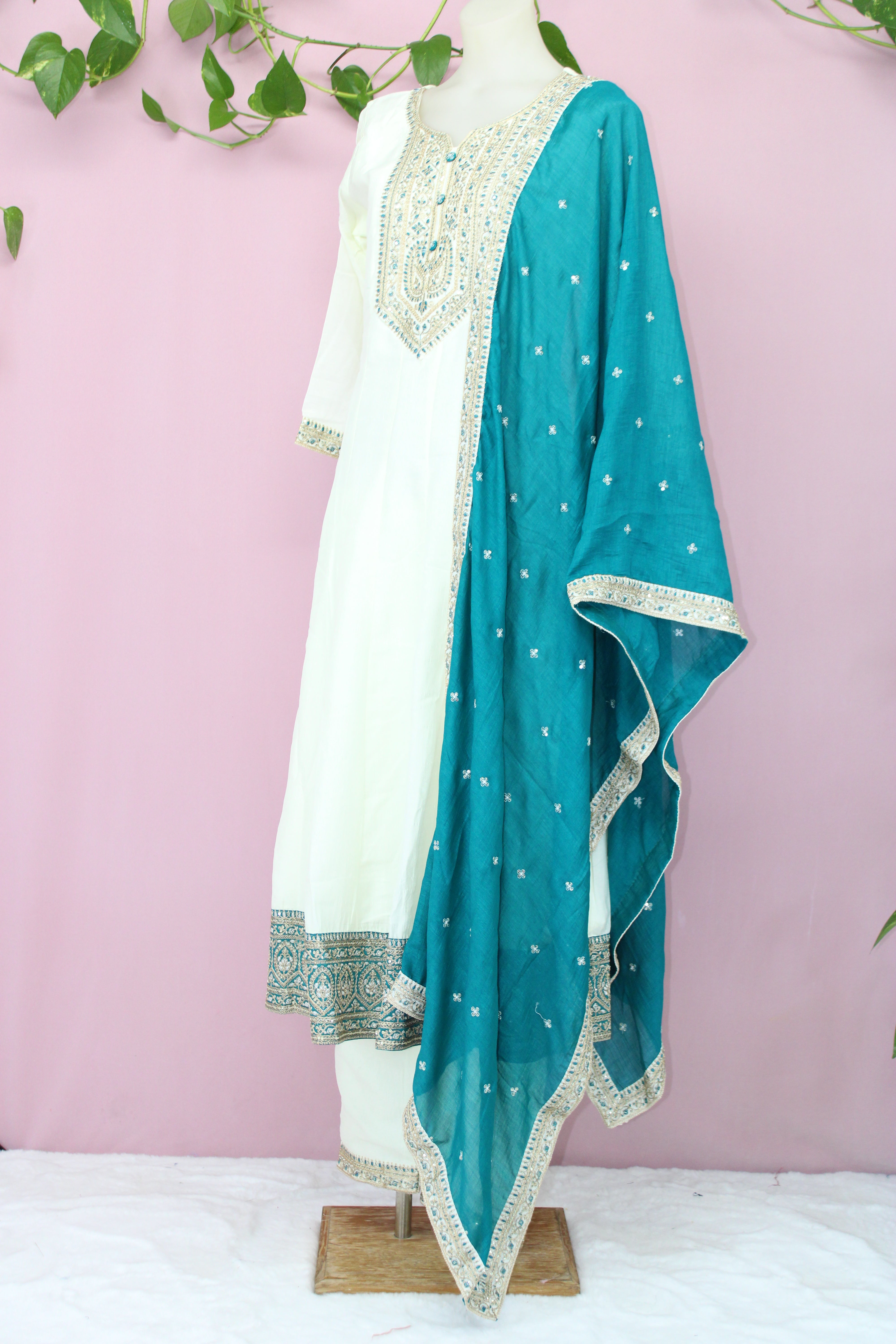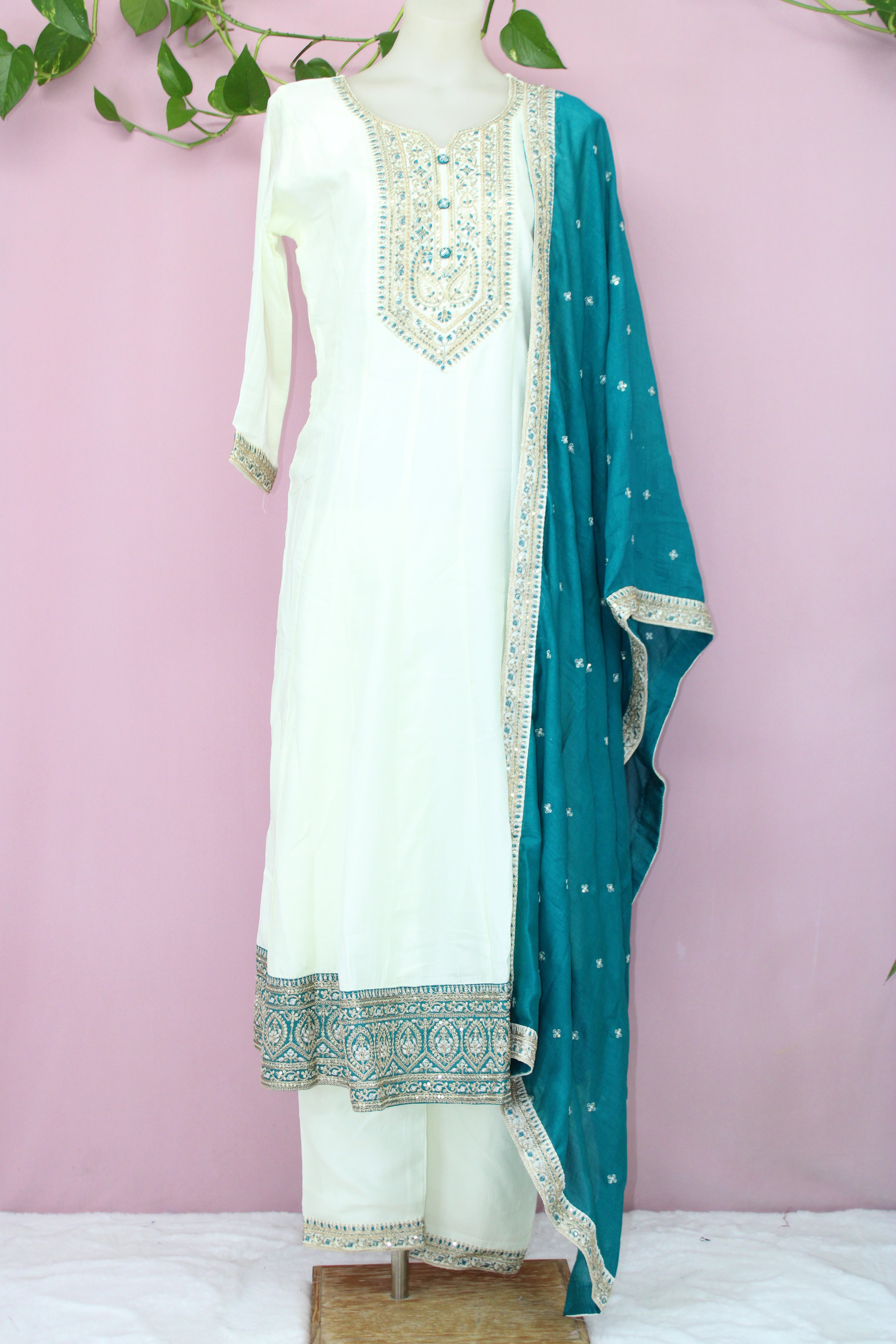 Make a graceful statement with this beautifully designed Anarkali suit crafted from luxurious Vichitra fabric, known for its rich texture and elegant fall. The suit features a full Anarkali silhouette with intricate embroidery on the neck yoke and ghera, adding a touch of regal charm.