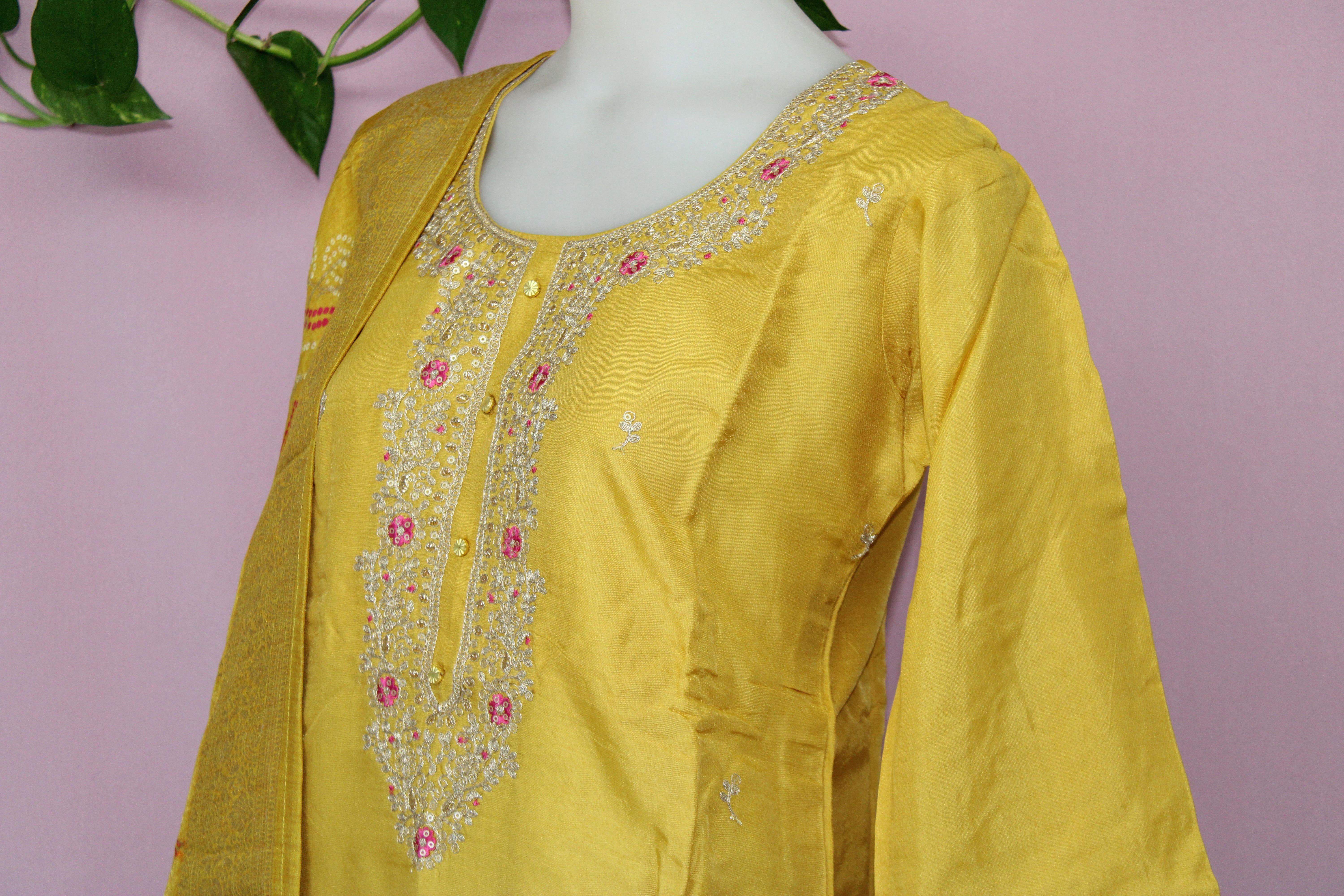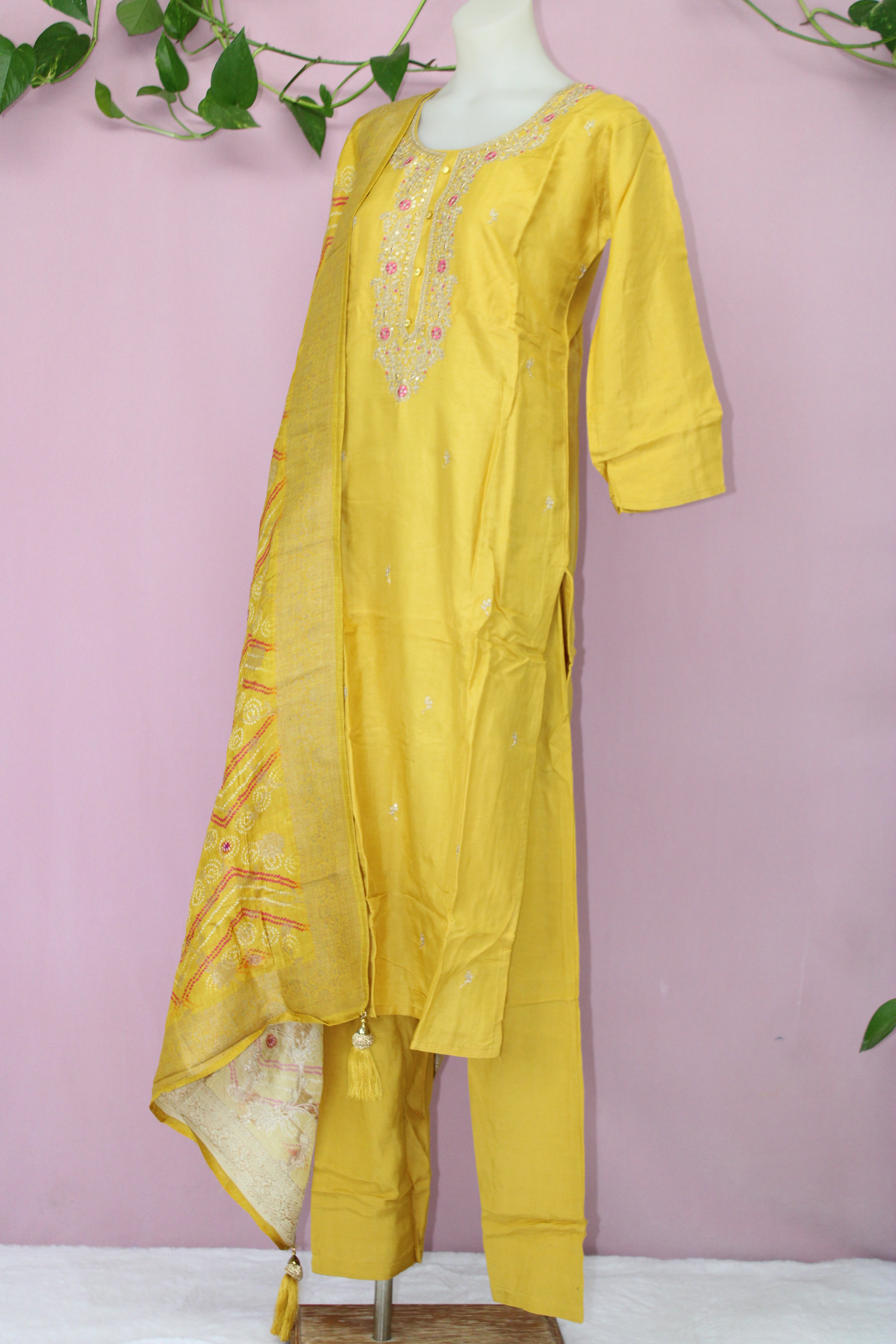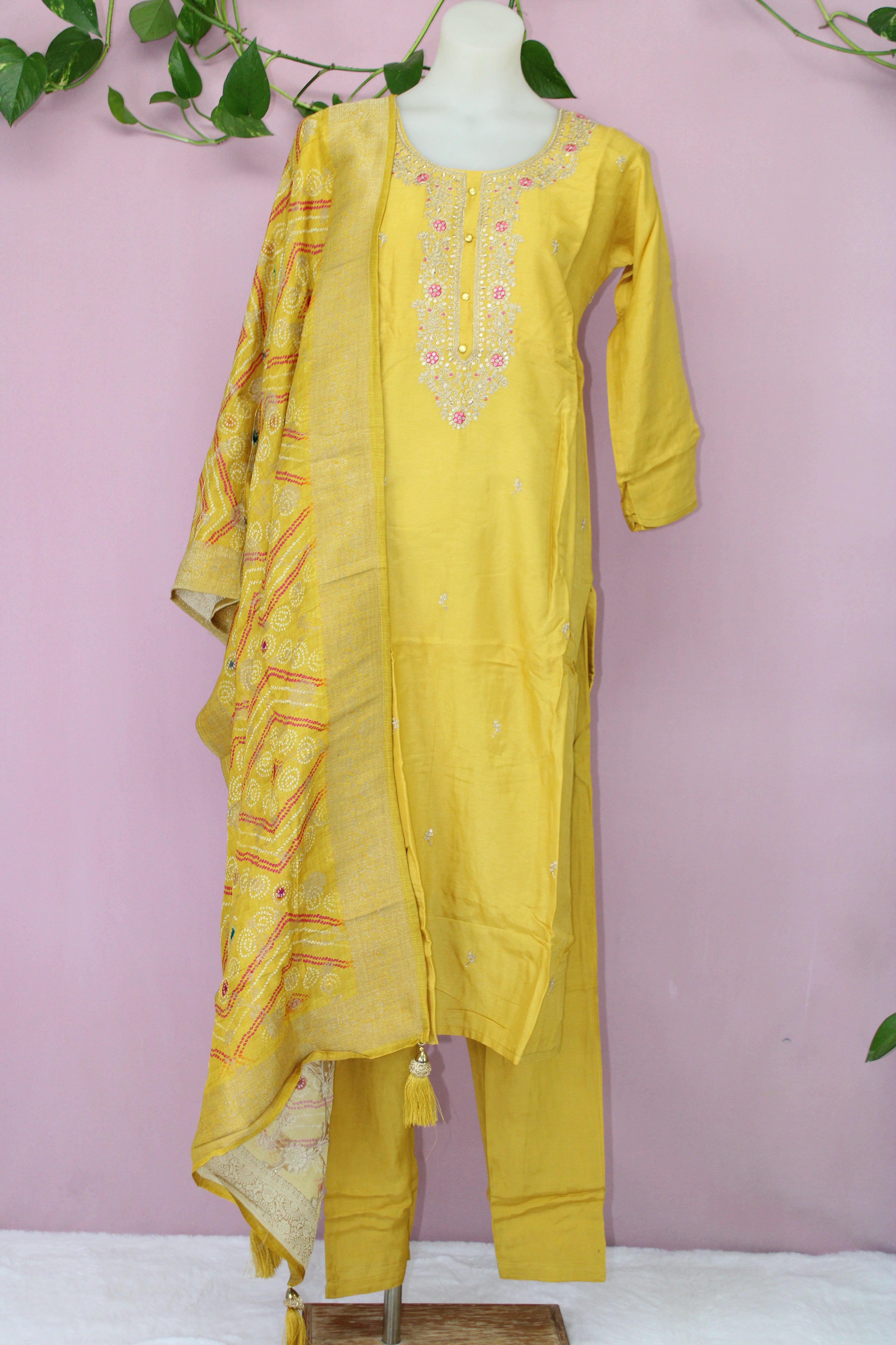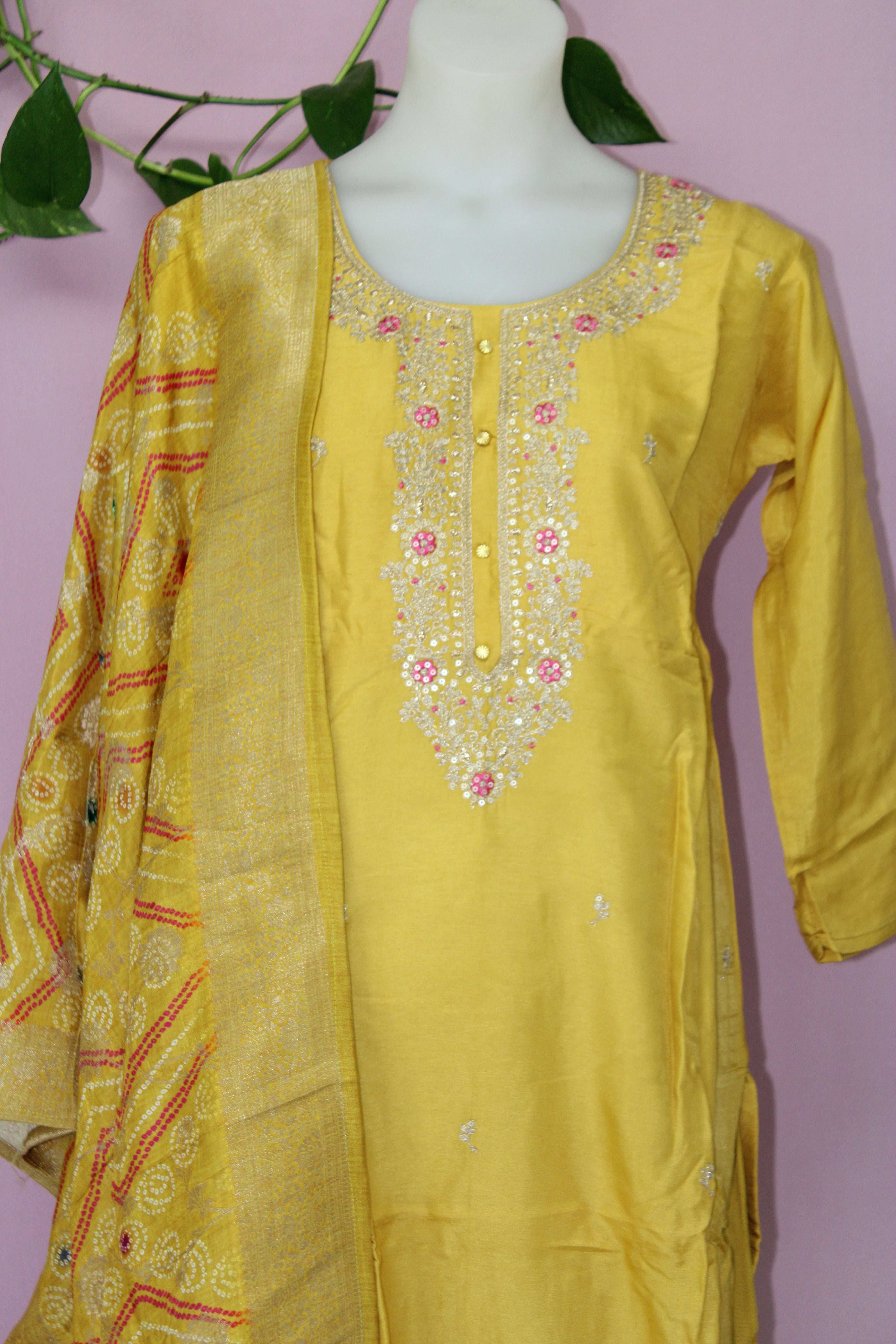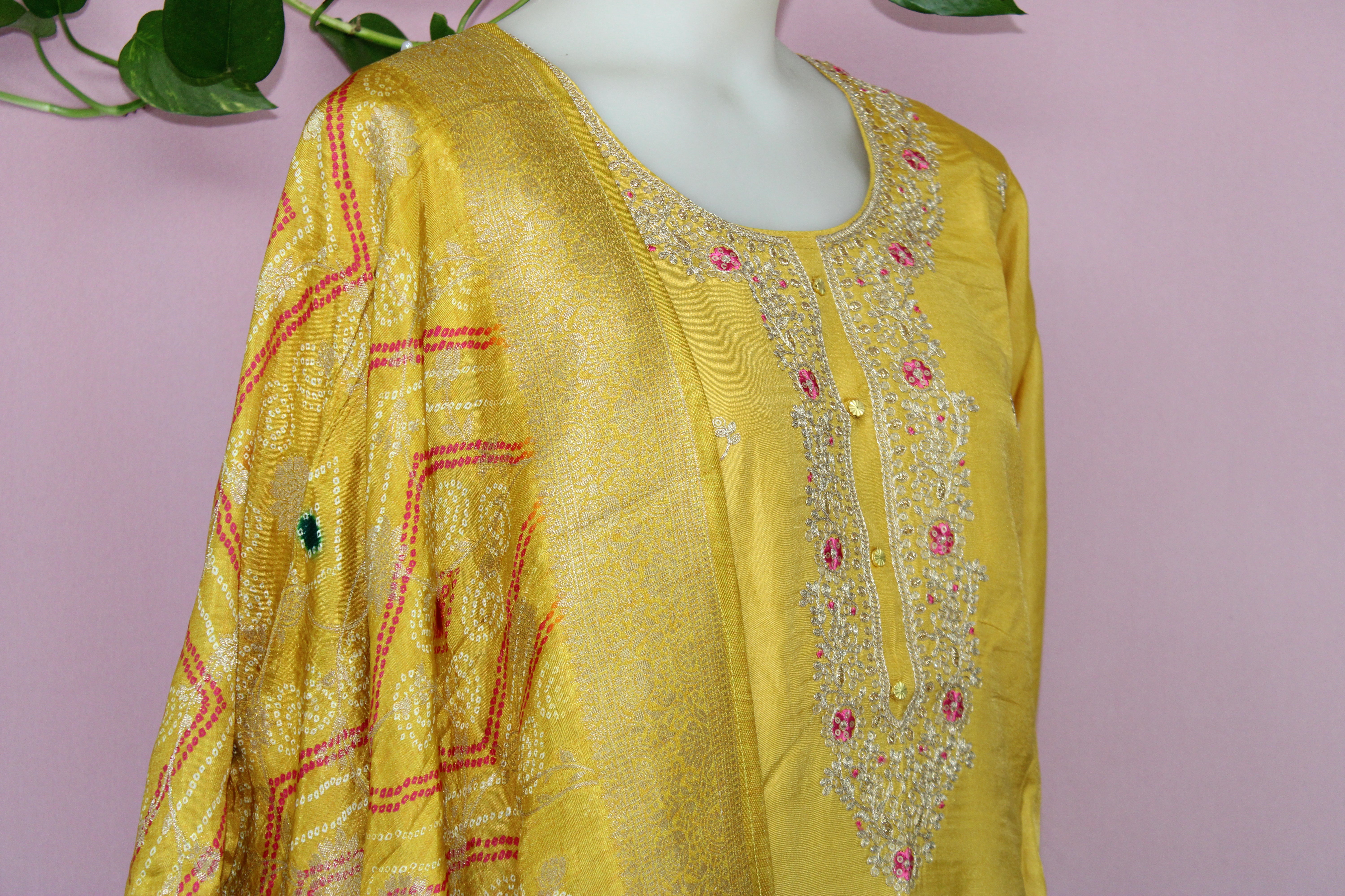 Elegant Silk Ensemble with Embroidered Details & Bandhani Dupatta