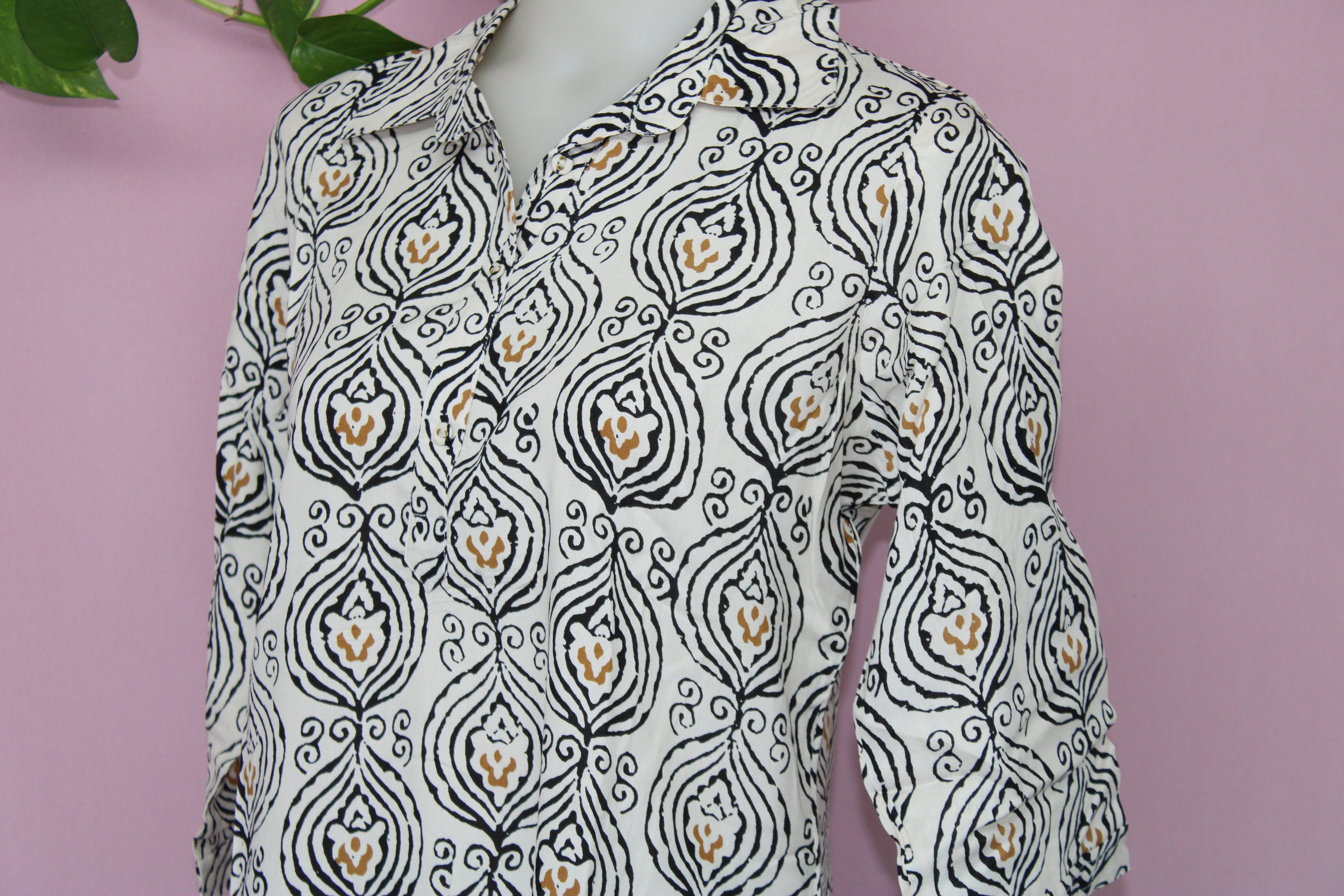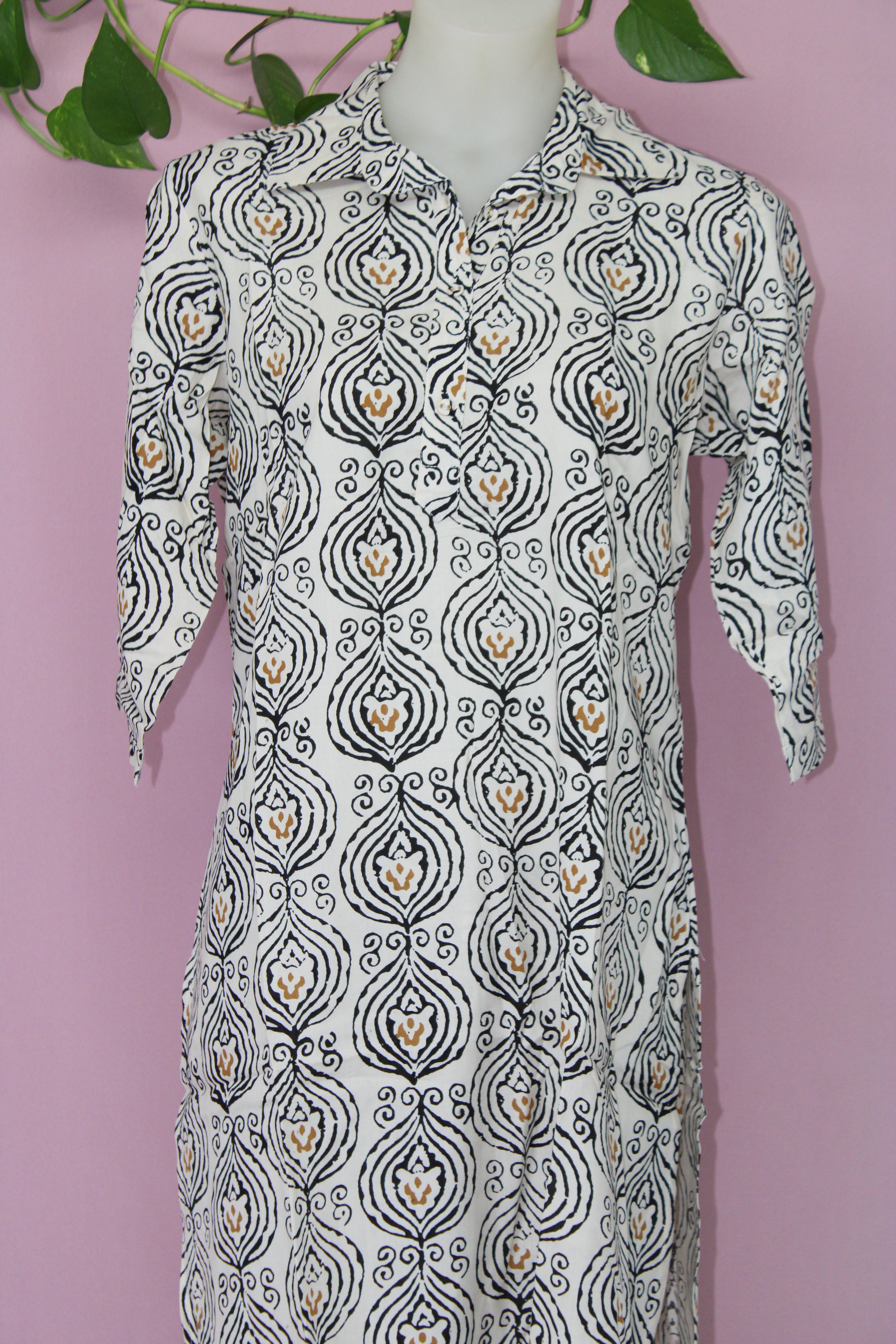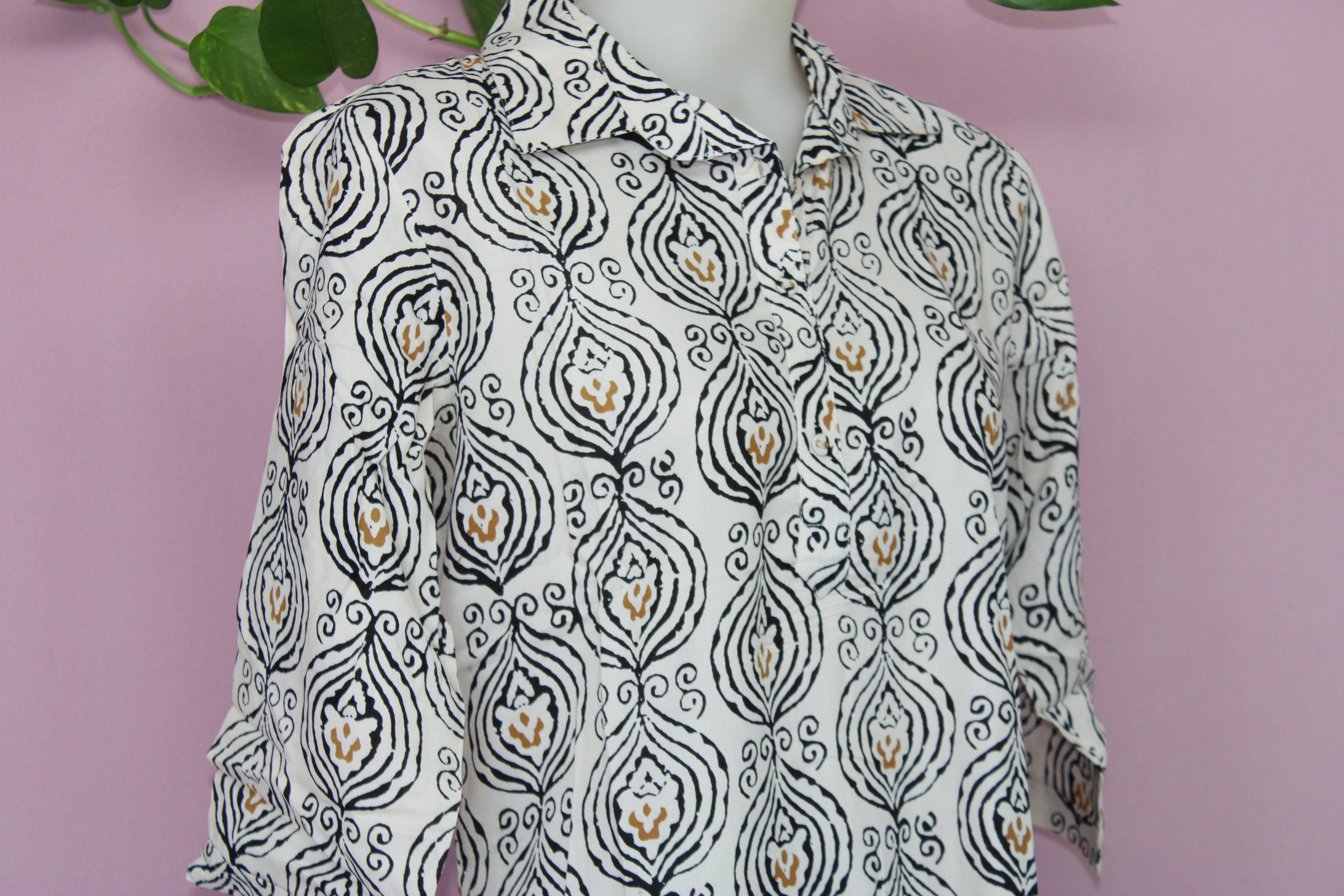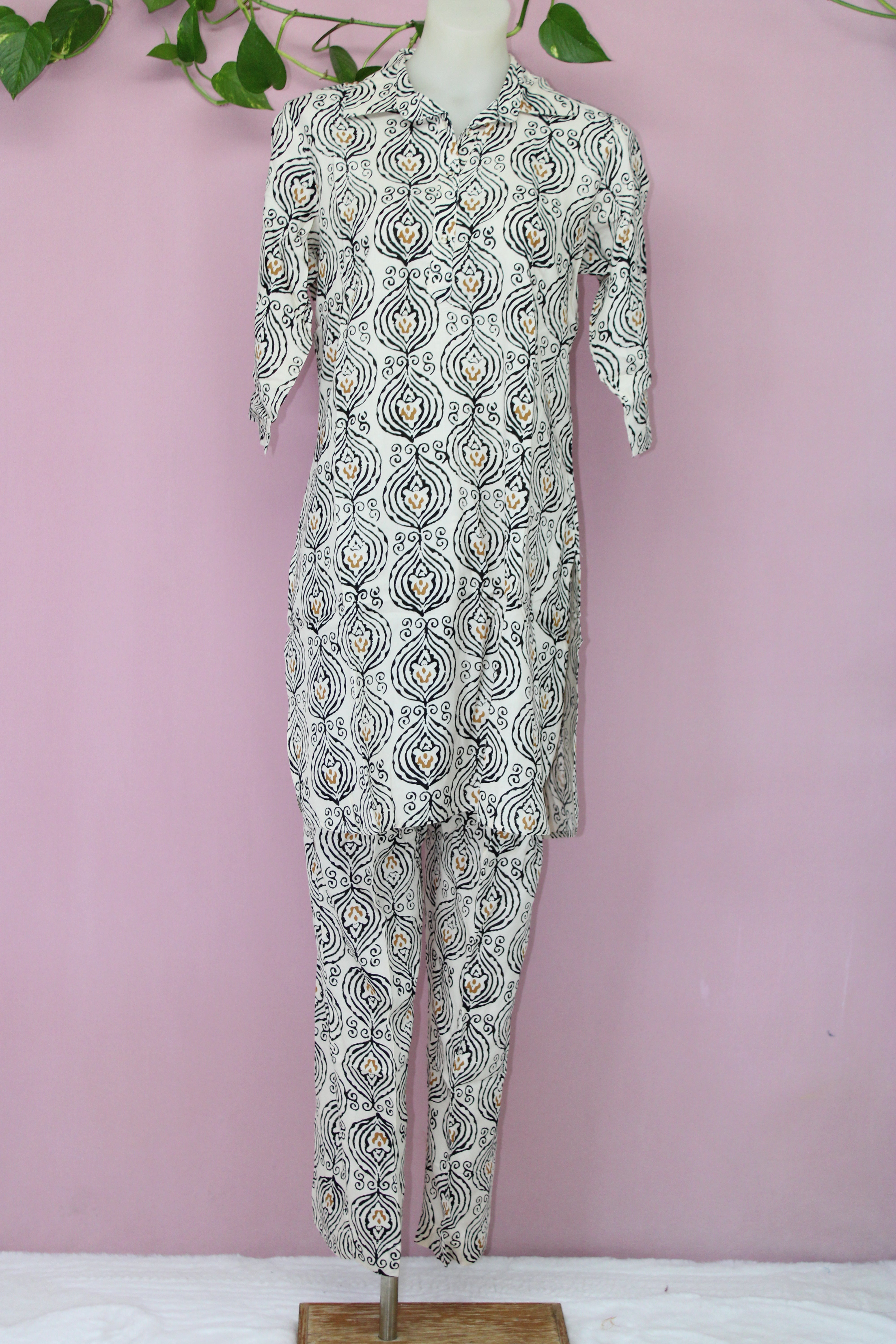 Elevate your everyday style with this stylish rayon co-set, adorned with traditional block printing for a handcrafted, artisanal look. Designed with a smart collar neckline, it features a detailed kurtapatti and button placket, adding structure and elegance to the silhouette.
