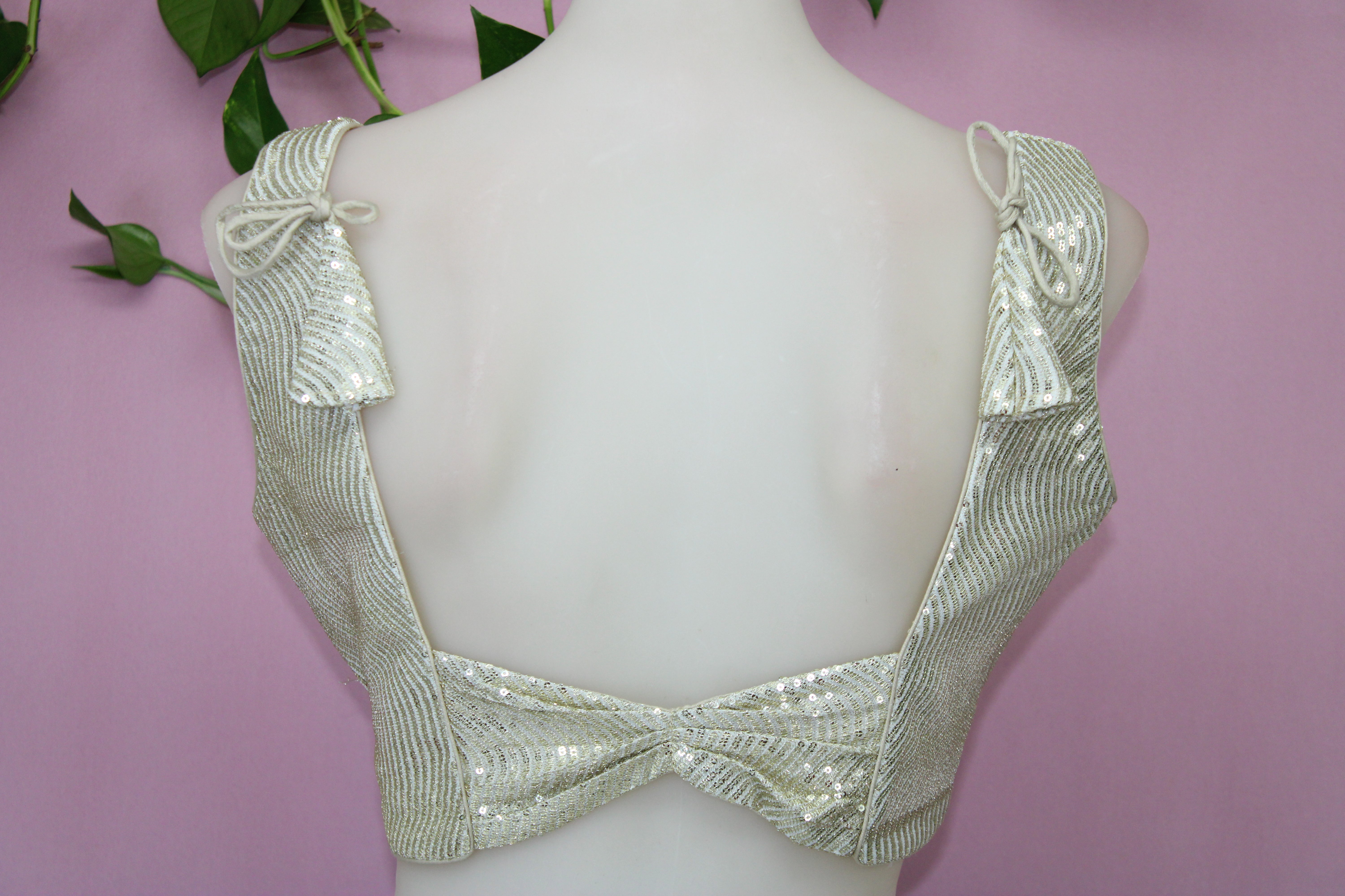 This elegant sequin-embroidered padded blouse features a flattering princess-cut silhouette and a sleek front V-neckline that enhances the overall look. The back bow neck with a dori adds a charming, feminine touch, making the design both stylish and graceful. Finished with side sizing for a comfortable, tailored fit, this blouse is perfect for elevating any festive or special-occasion outfit.