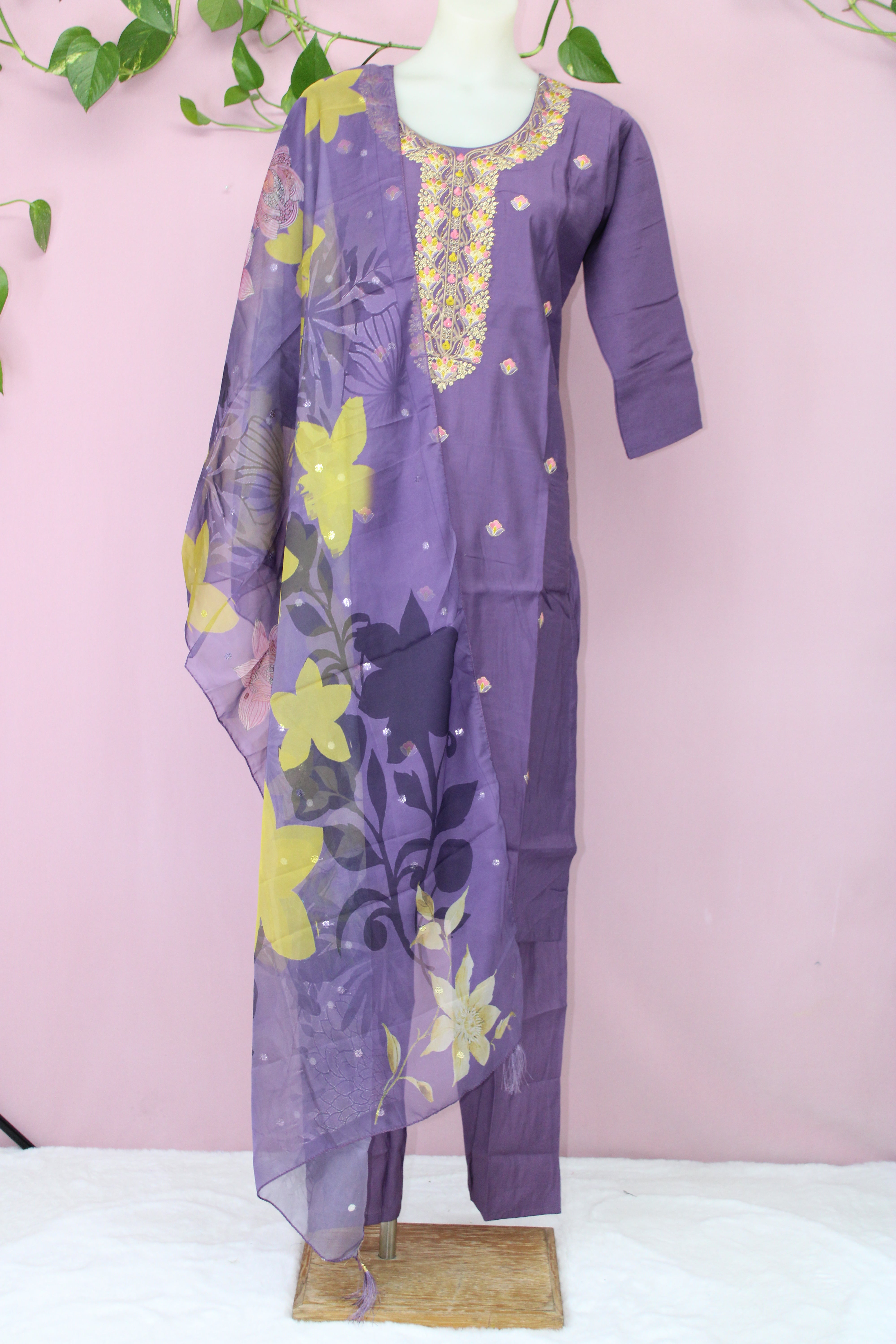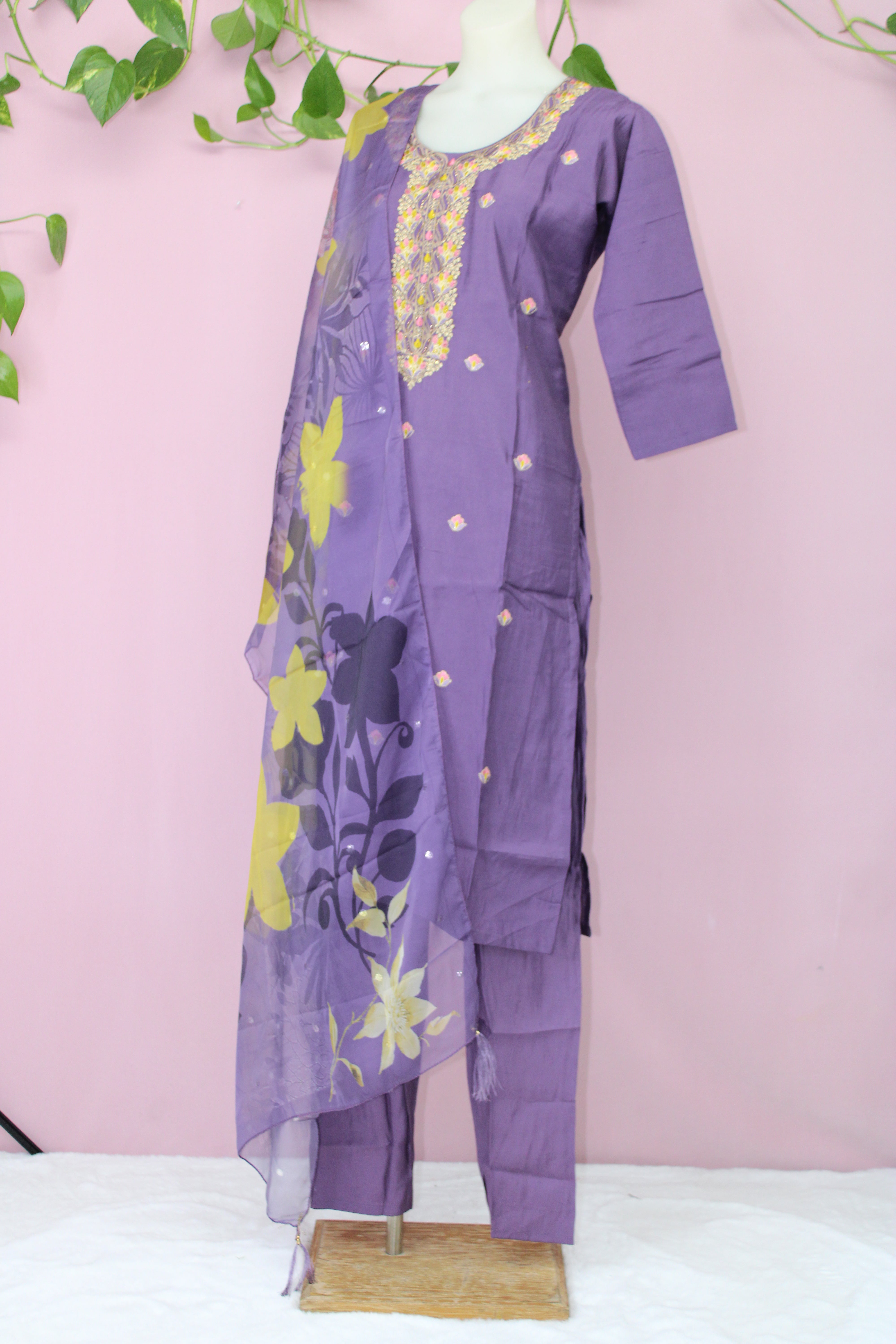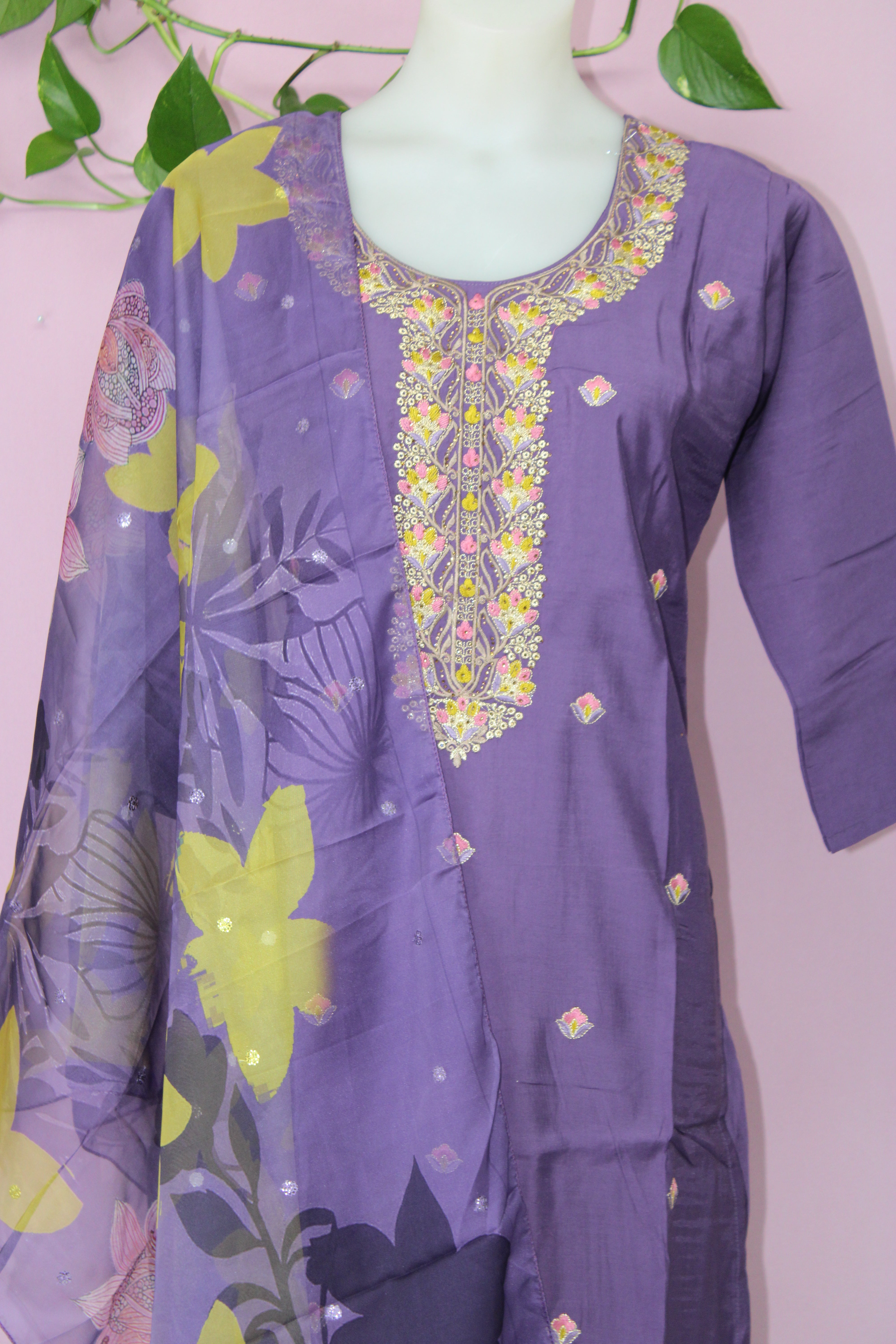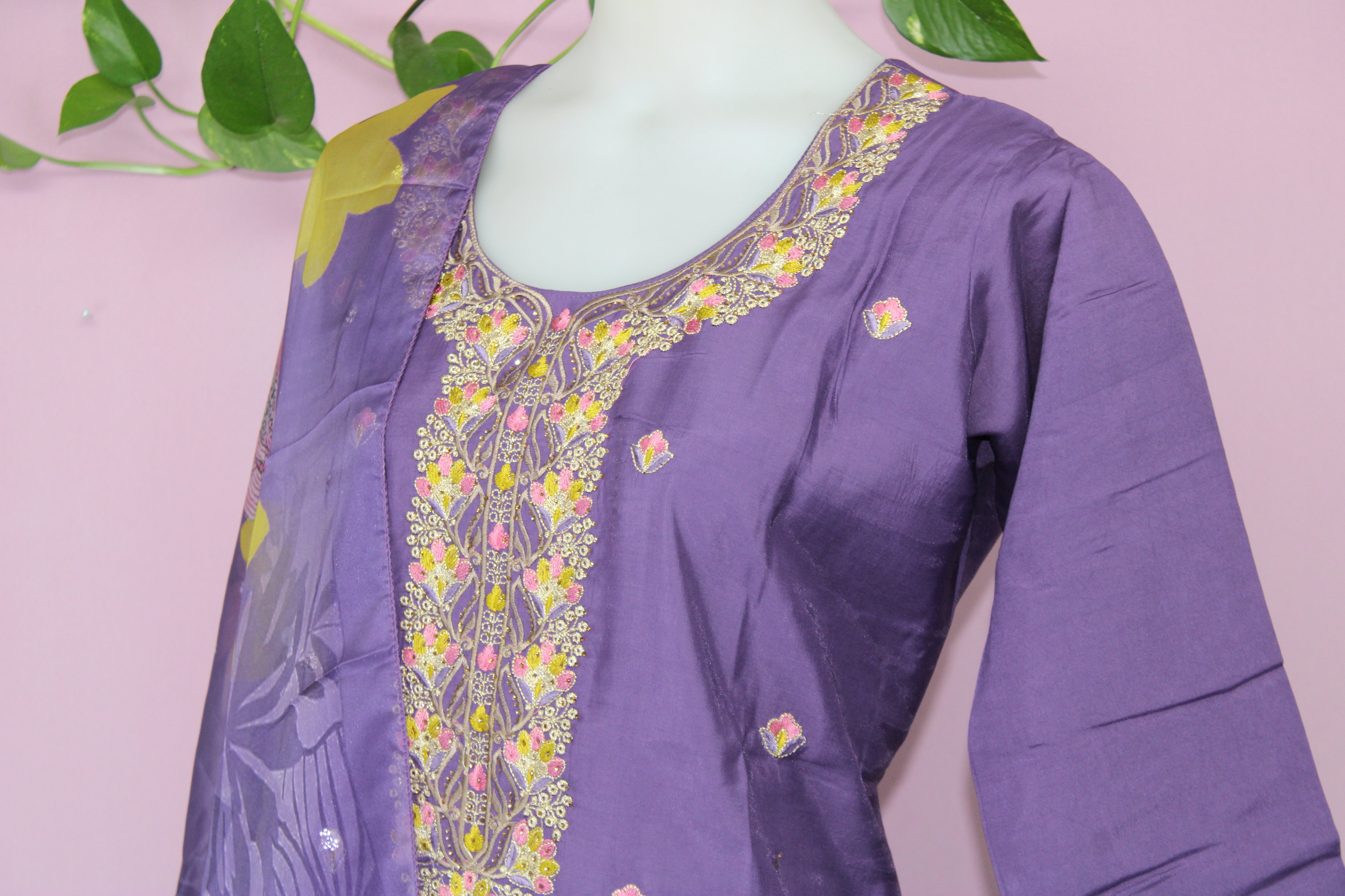 Make a statement in this elegant ensemble, crafted from luxurious silk fabric for a rich and graceful drape. The lined shirt offers structure and comfort, while the embroidered neckline embellished with Swarovski work adds a refined sparkle, perfect for special occasions.