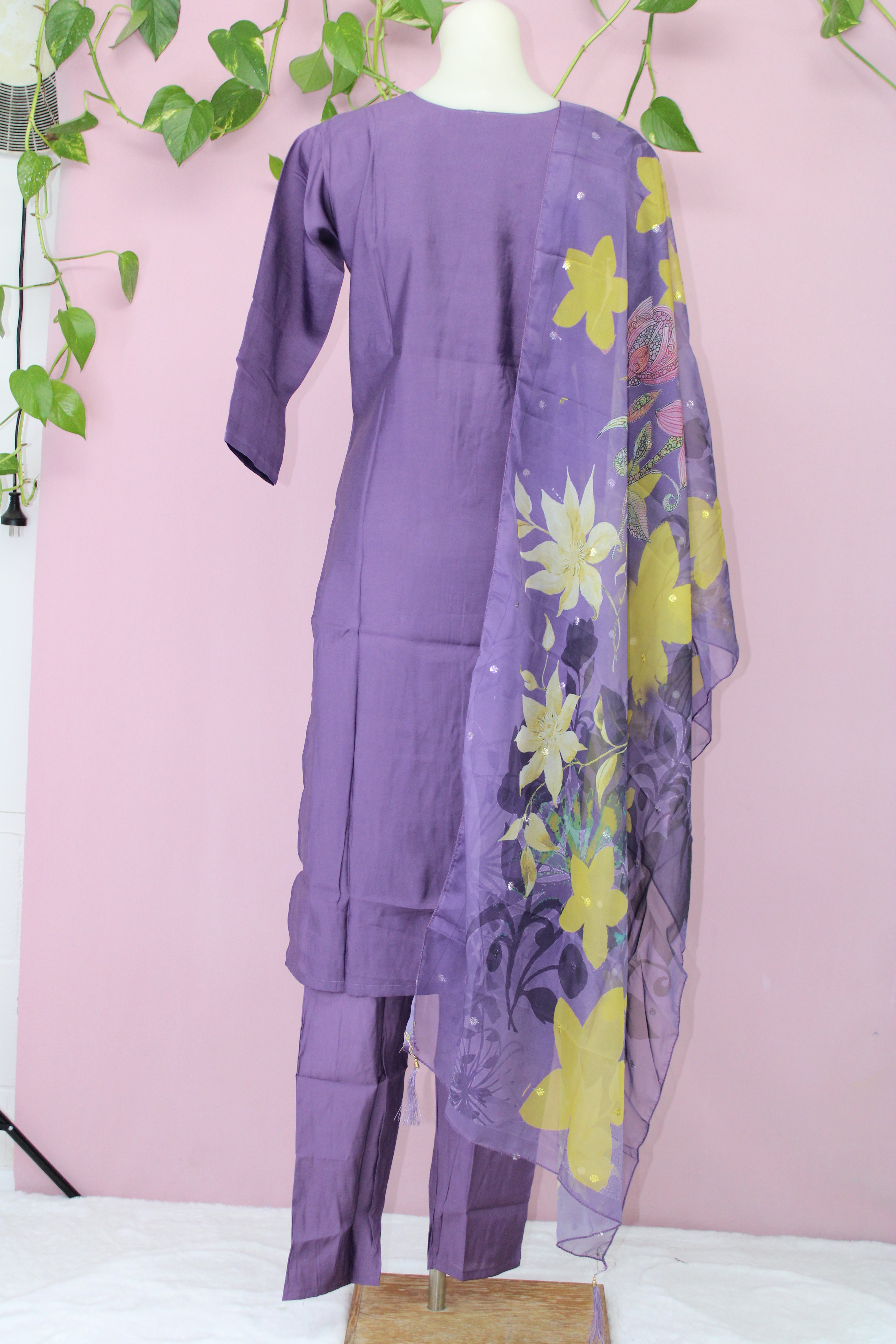 Delicate allover bootis enhance the fabric with subtle charm, creating a timeless, sophisticated look. The outfit is paired with a printed organza dupatta, beautifully detailed with sequined bootis and four corner hangings, adding a touch of festive elegance and movement.