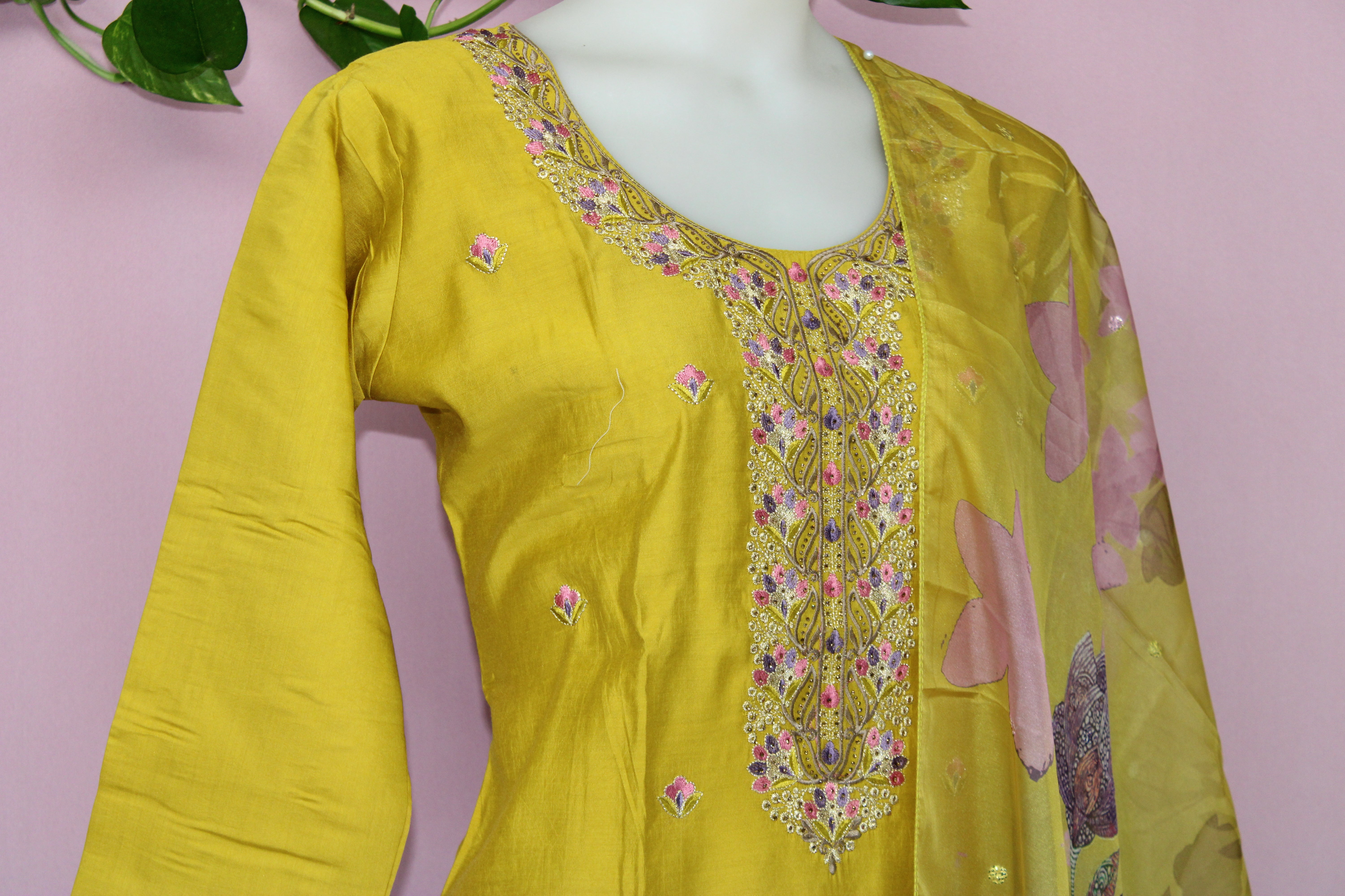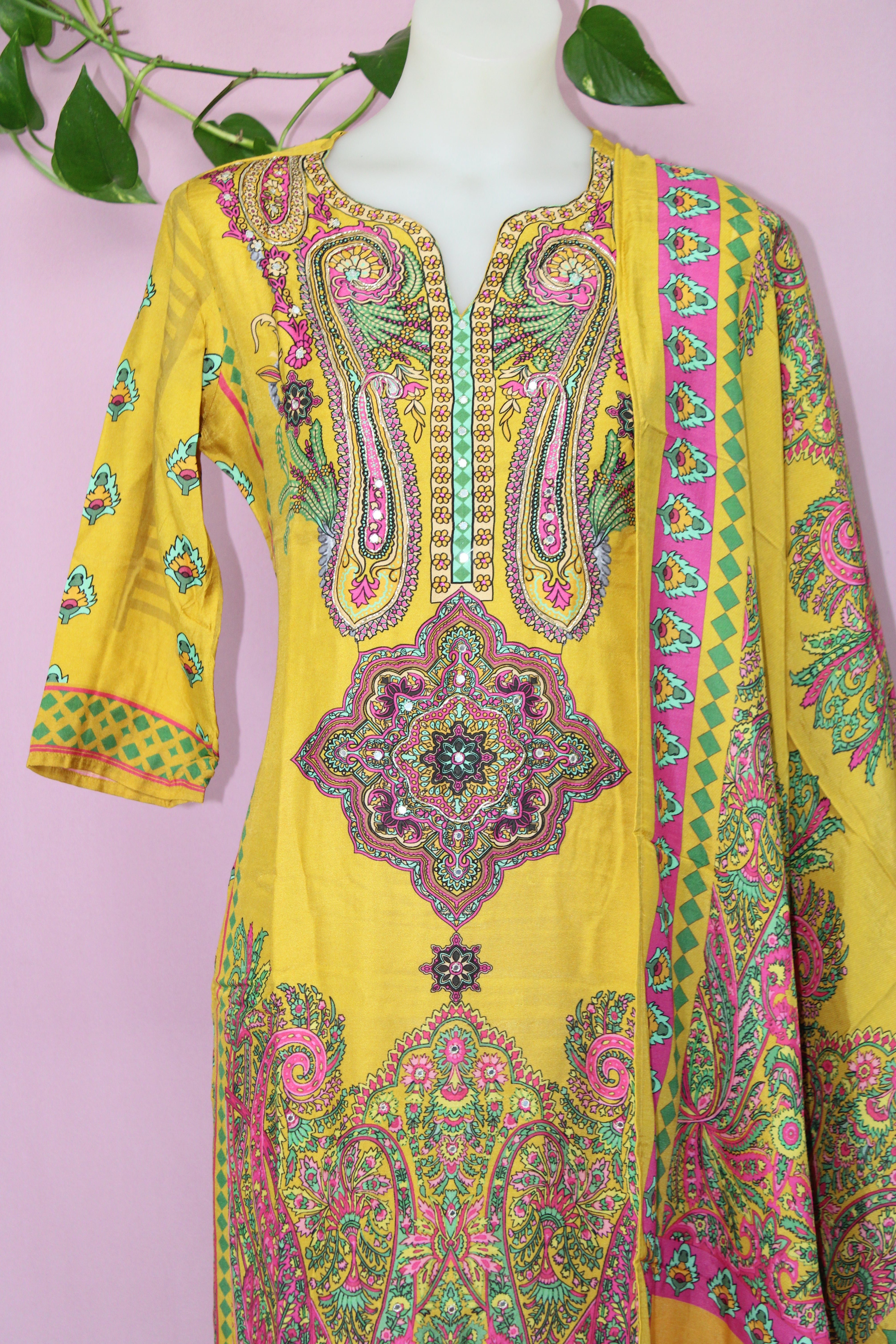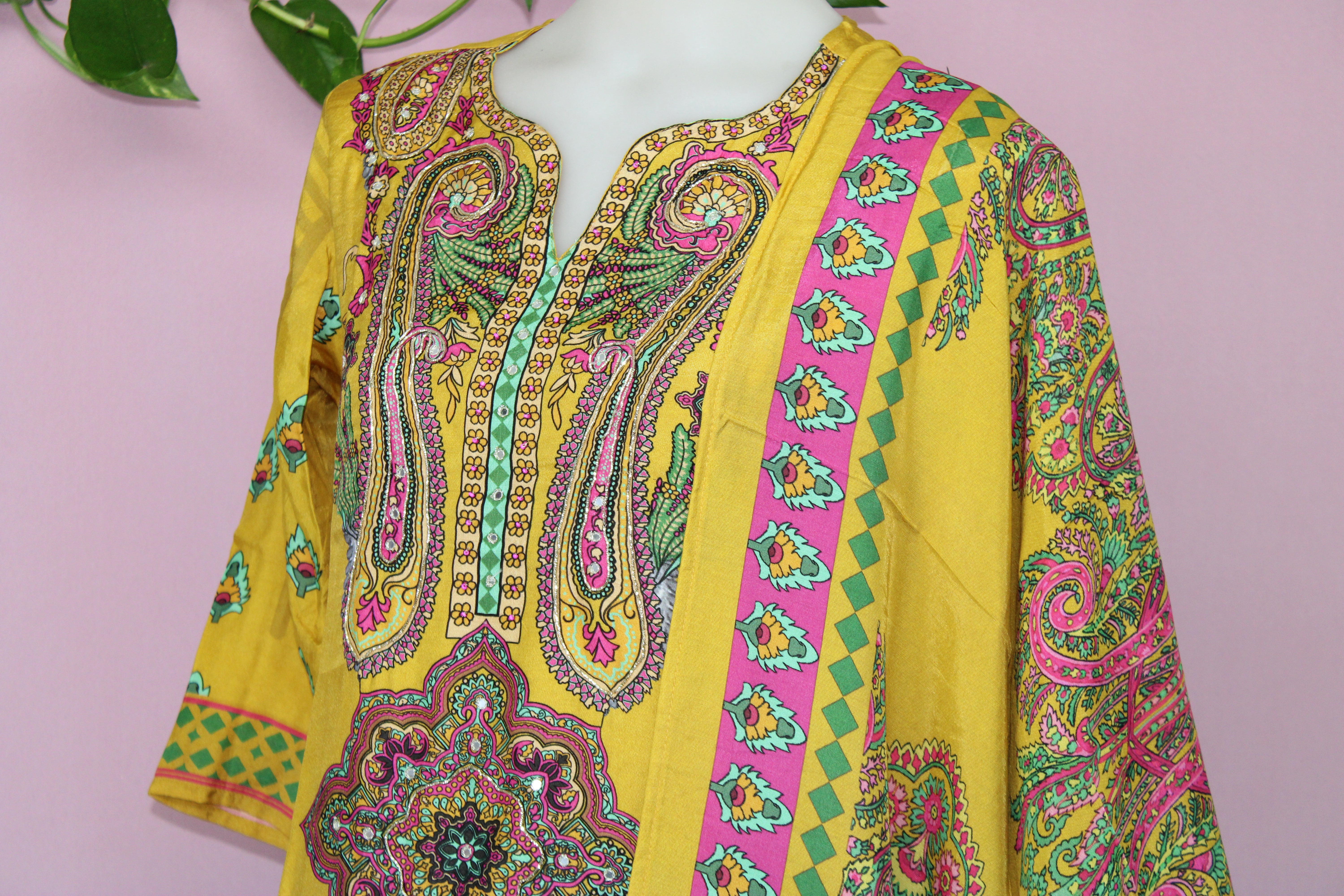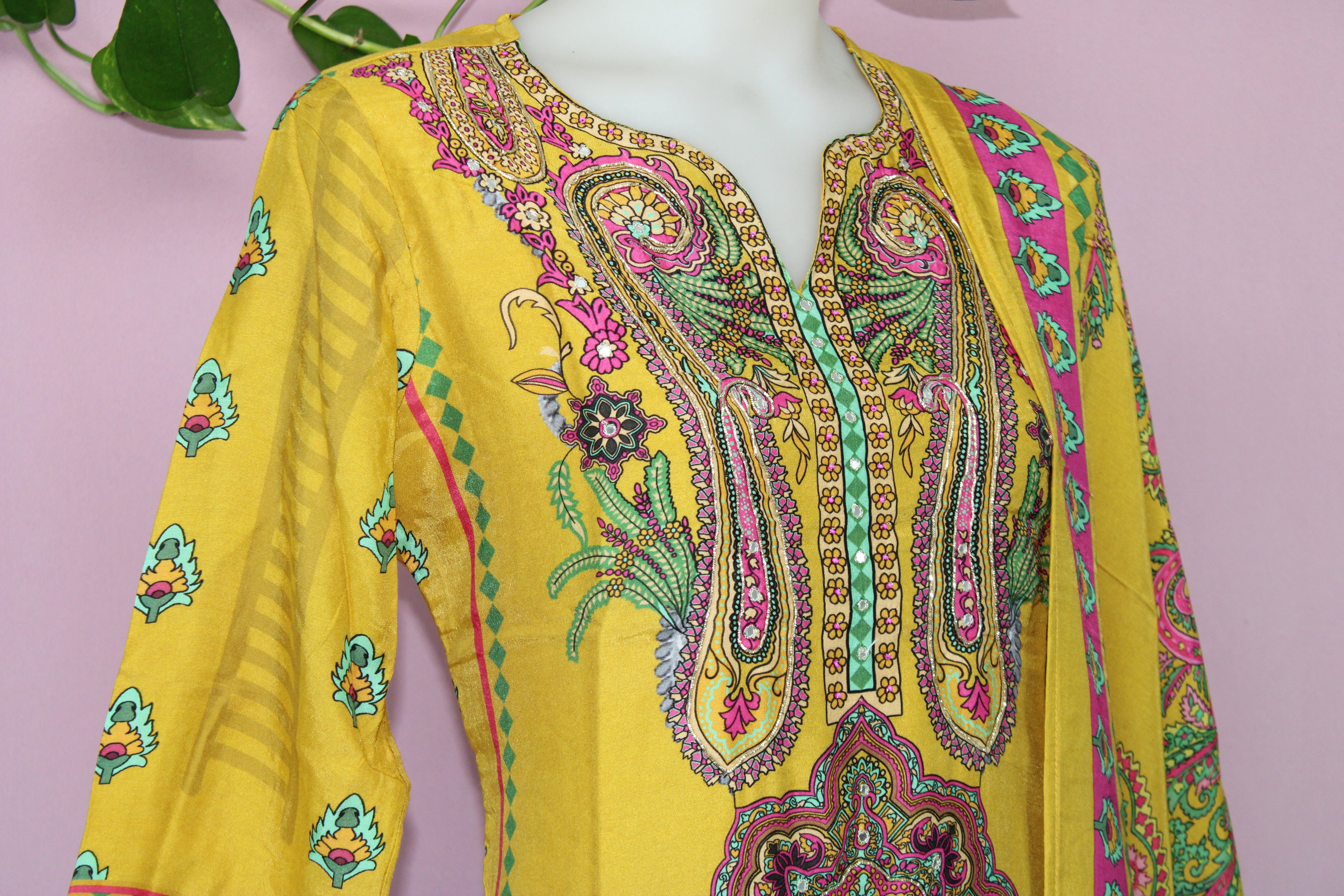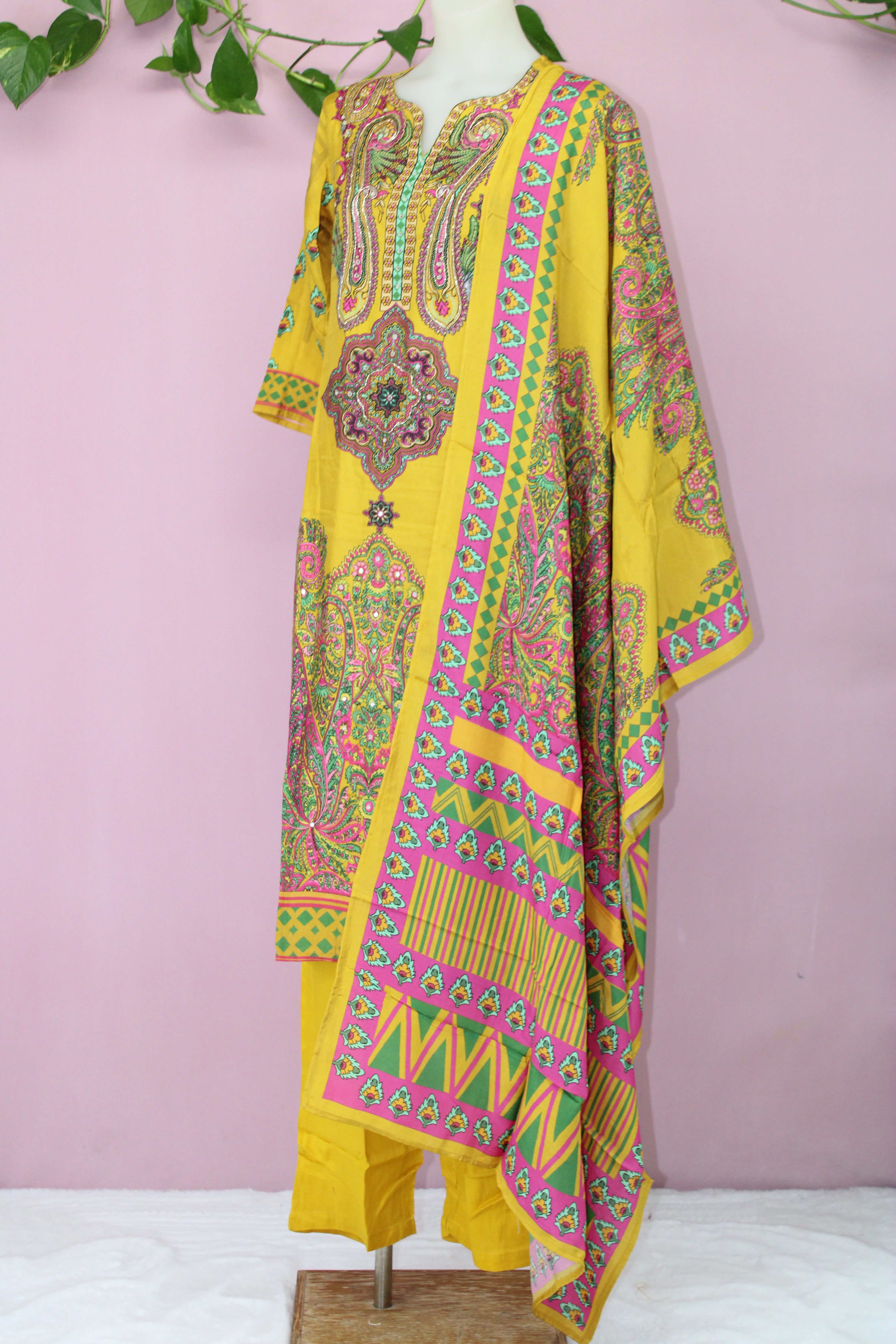 Elevate your wardrobe with this exquisitely crafted ensemble, featuring pure muslin fabric known for its lightweight and breathable texture. The shirt showcases an elegant Pakistani floral digital print, enhanced with intricate hand embroidery and delicate mirror work for a refined traditional touch. Designed for comfort and modesty, the shirt includes a soft lining.