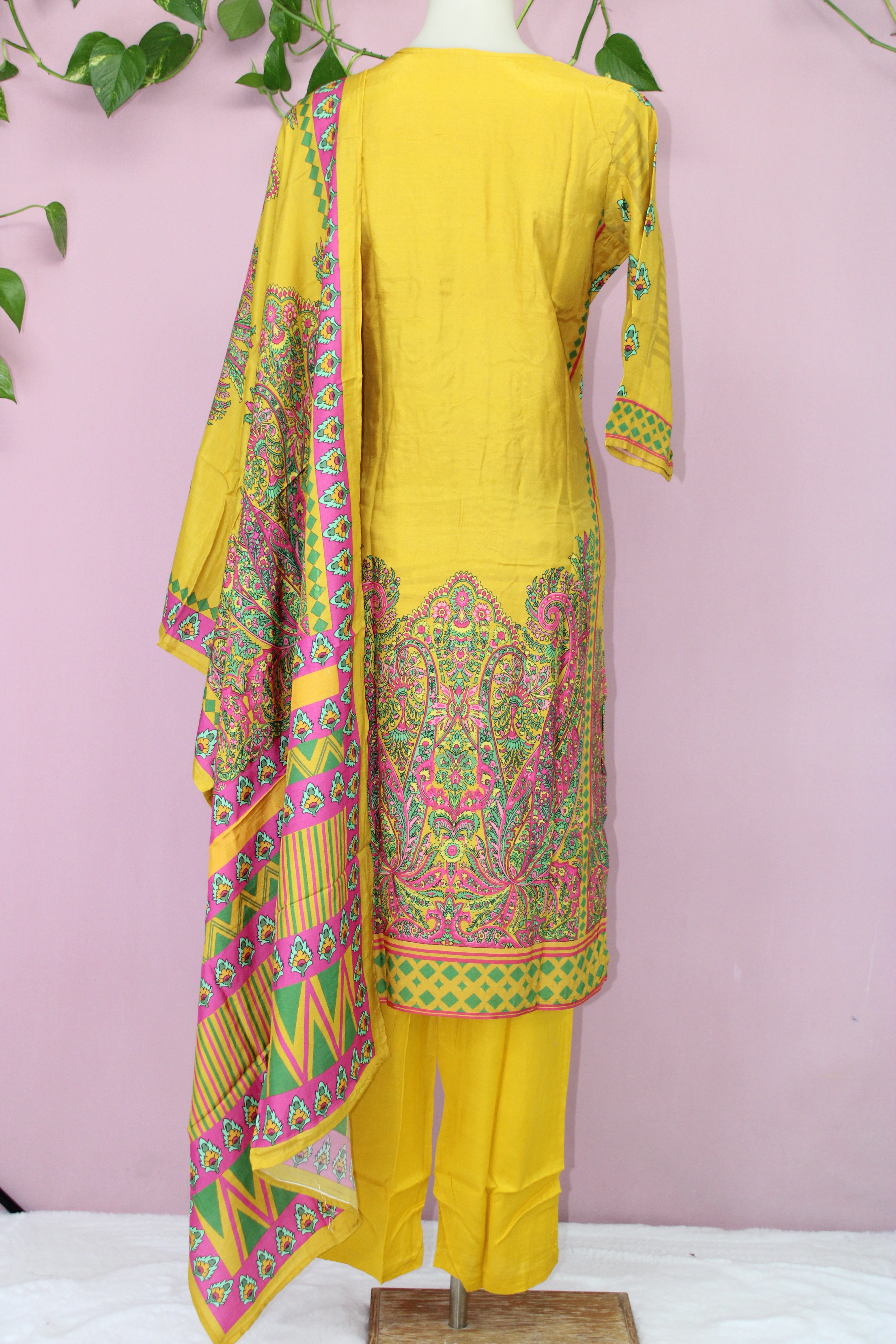 Paired with a digitally printed muslin dupatta, this outfit exudes timeless charm and effortless grace. The matching pants feature an adjustable waist and practical pockets, combining style with everyday convenience.