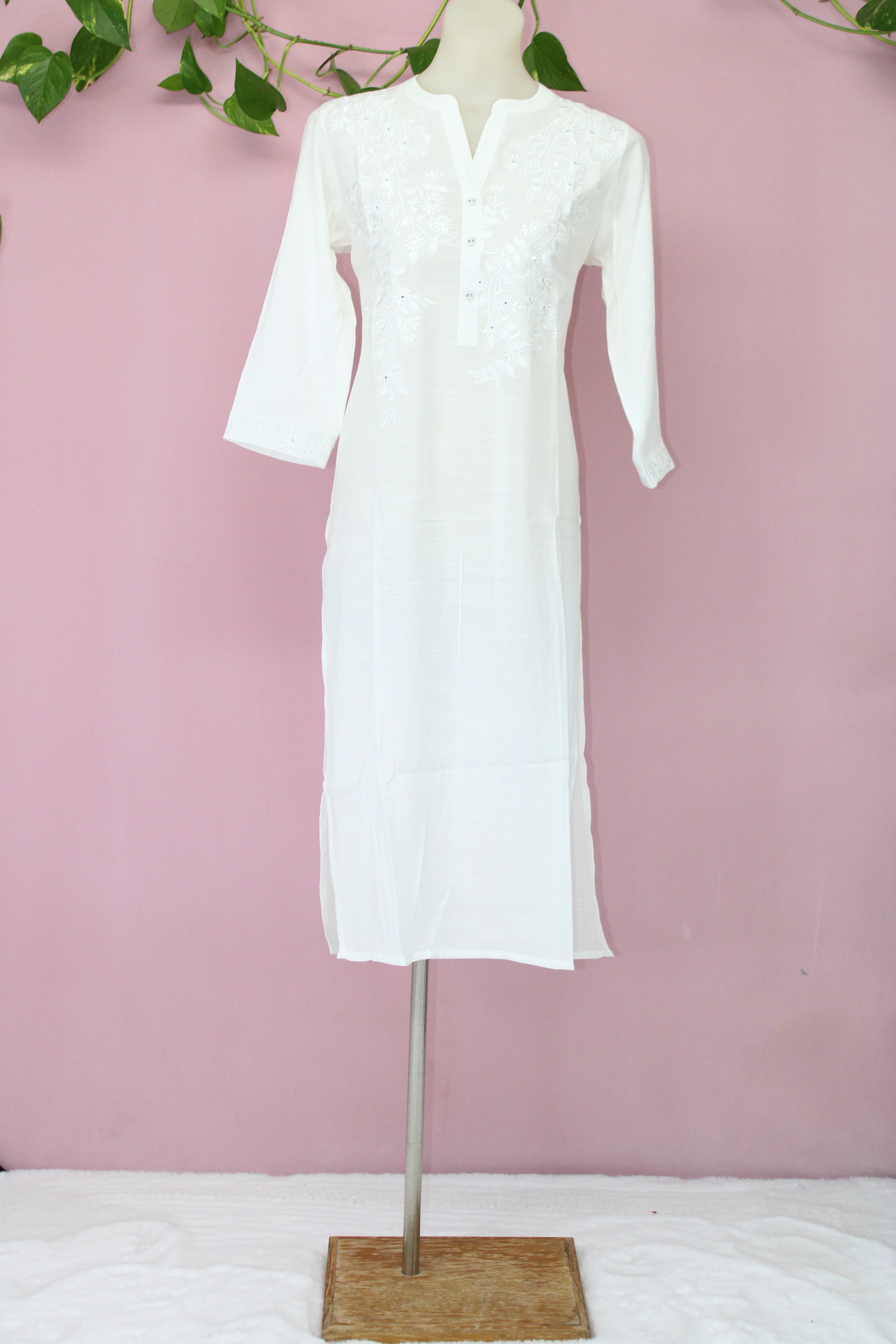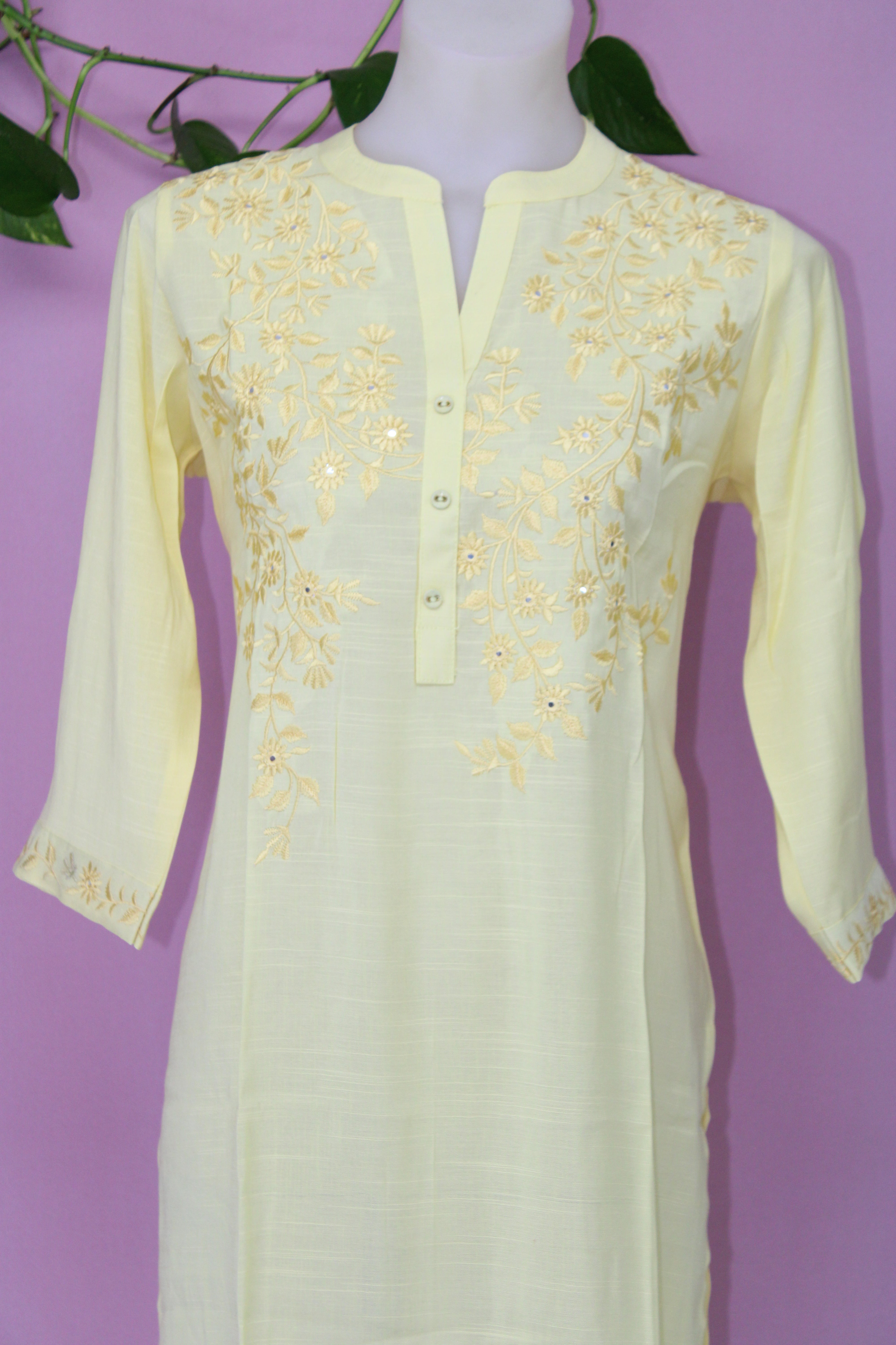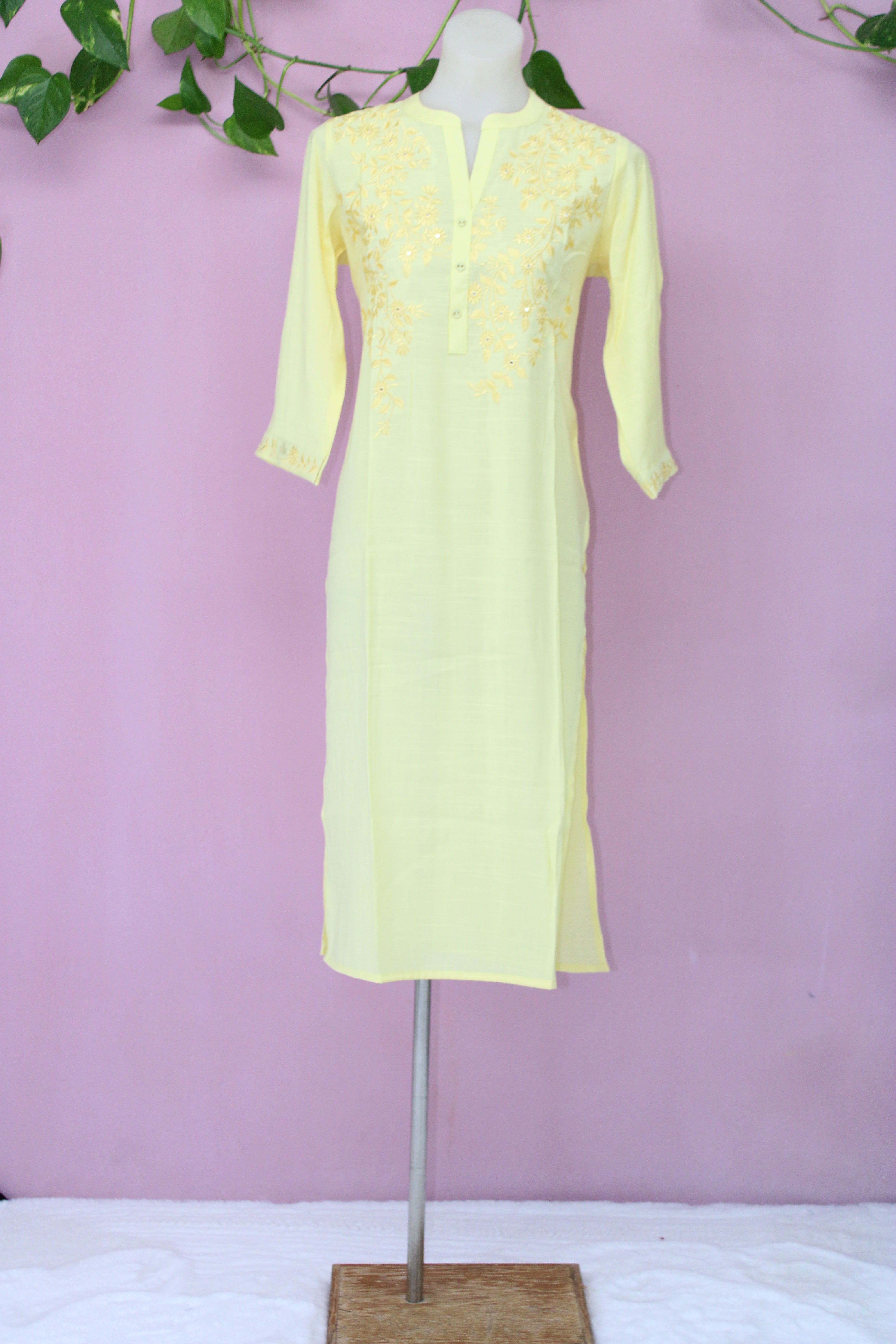 The design is completed with a sleek Mandarin collar, adding a modern, structured touch to this traditional silhouette. Ideal for daytime events or festive occasions, this outfit blends comfort, elegance, and artisanal charm effortlessly.