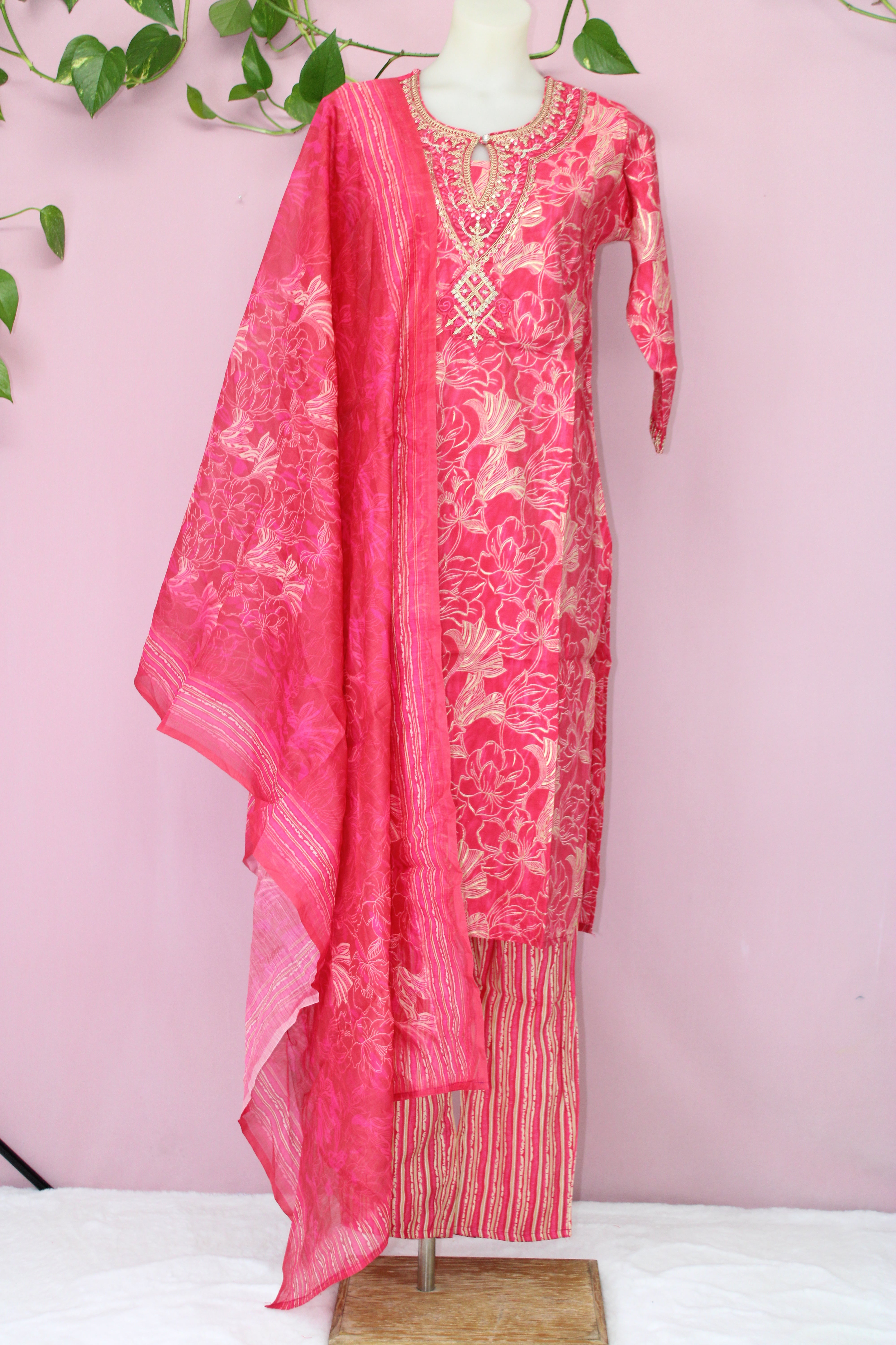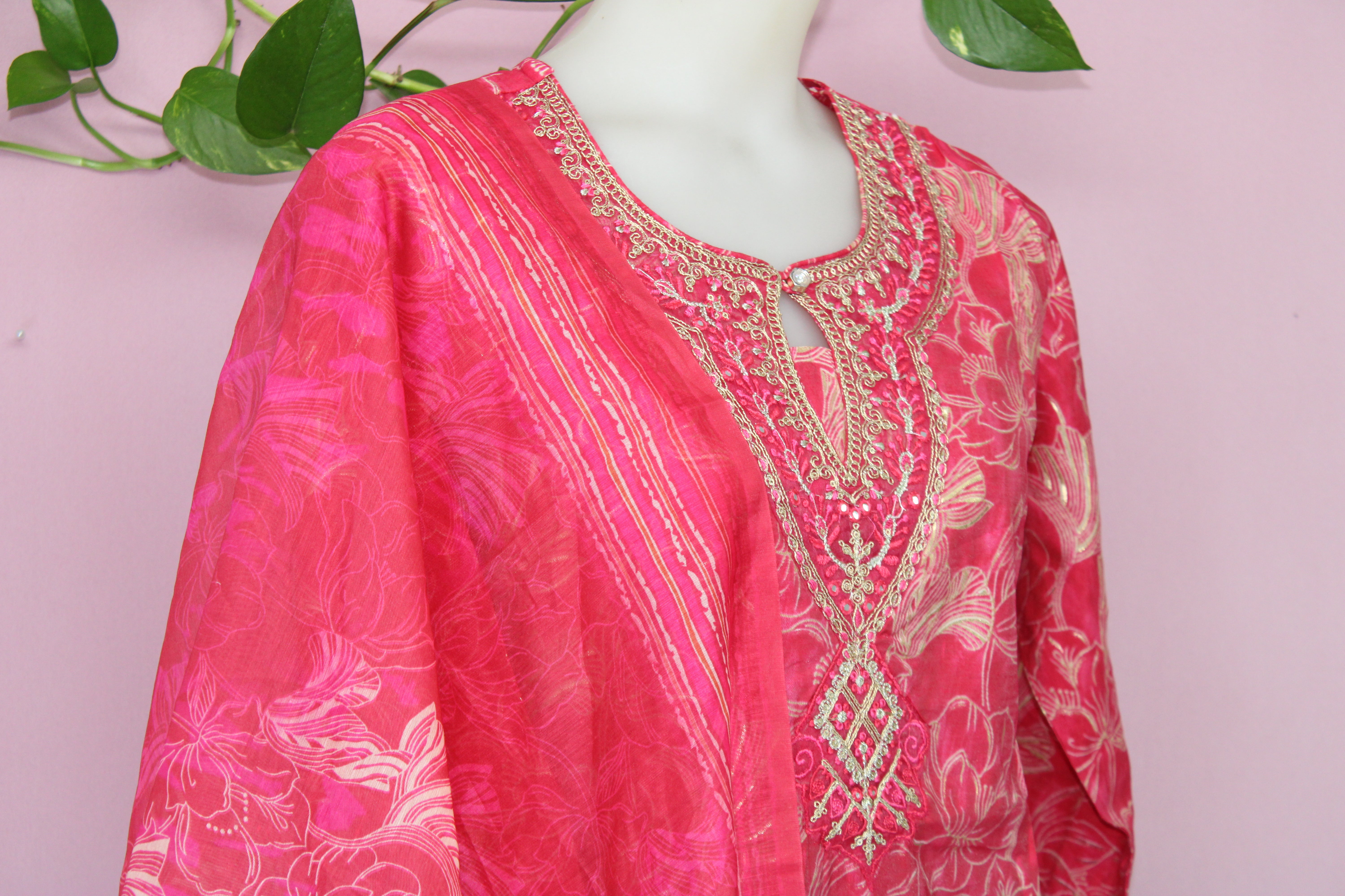 Printed Muslin Ensemble with Embroidered Yoke & Classic Detailing