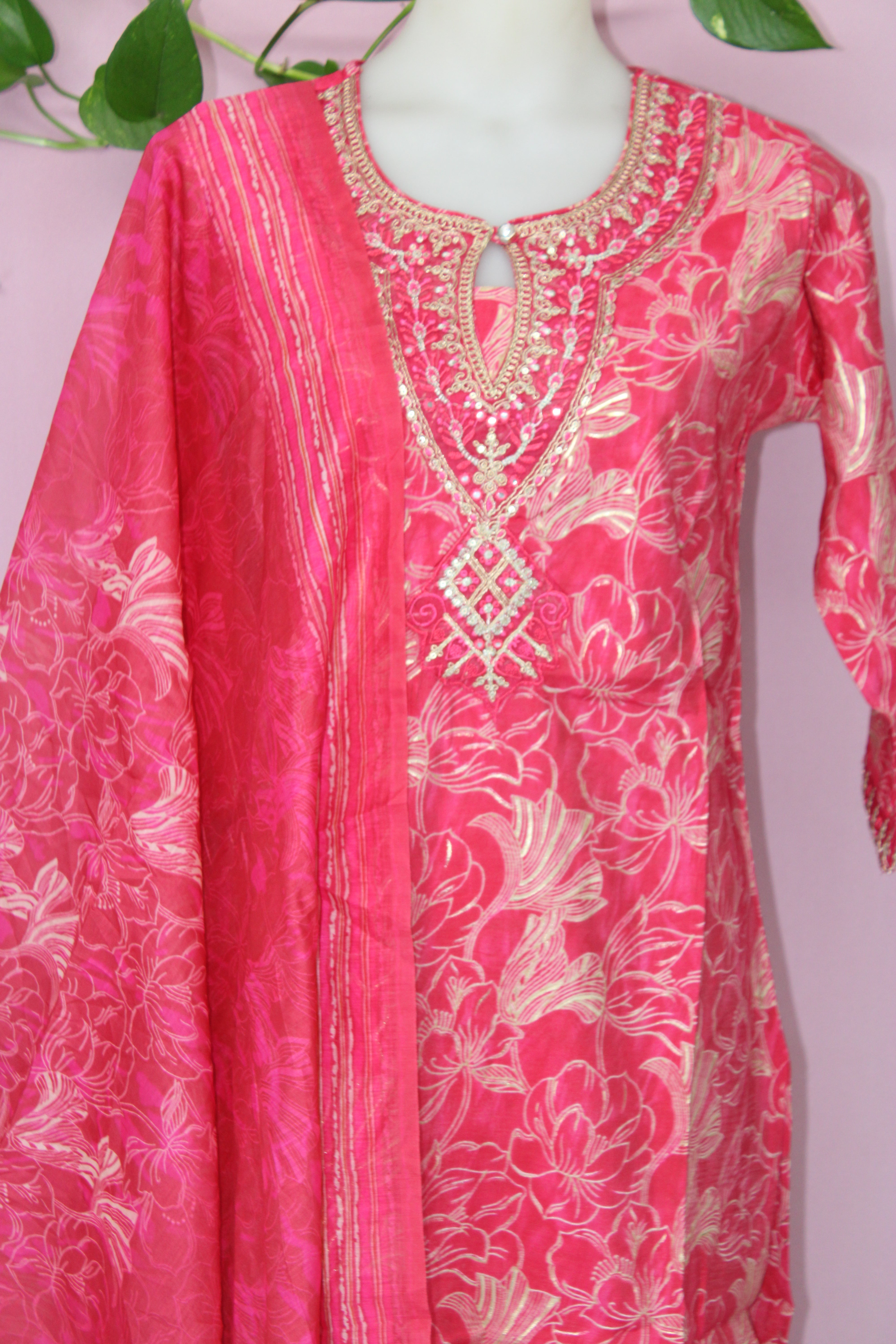 The neck yoke is adorned with intricate embroidery, offering a refined touch of craftsmanship. Coordinated prints across the shirt, dupatta, and pants create a cohesive, contemporary look that blends tradition with everyday wearability.