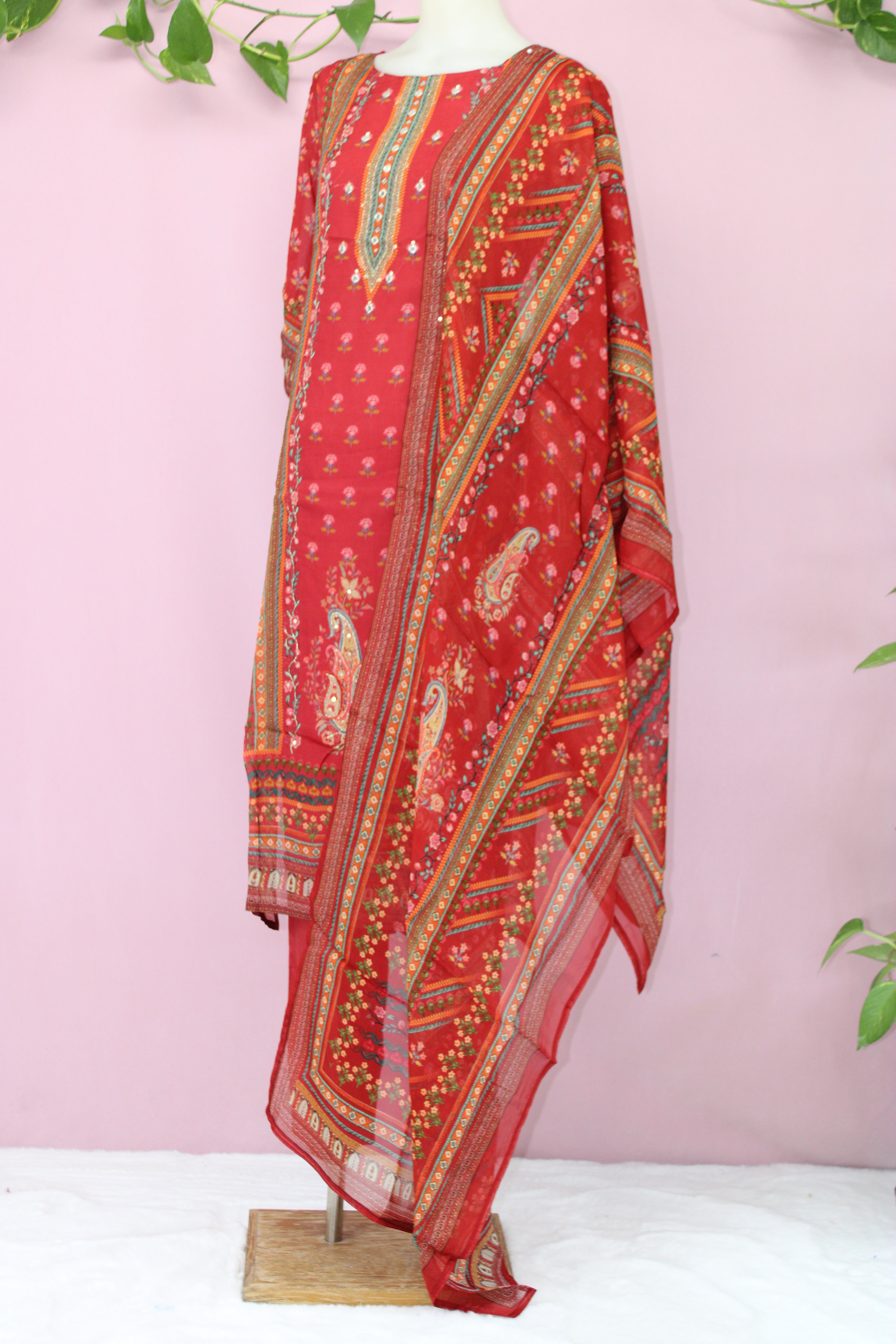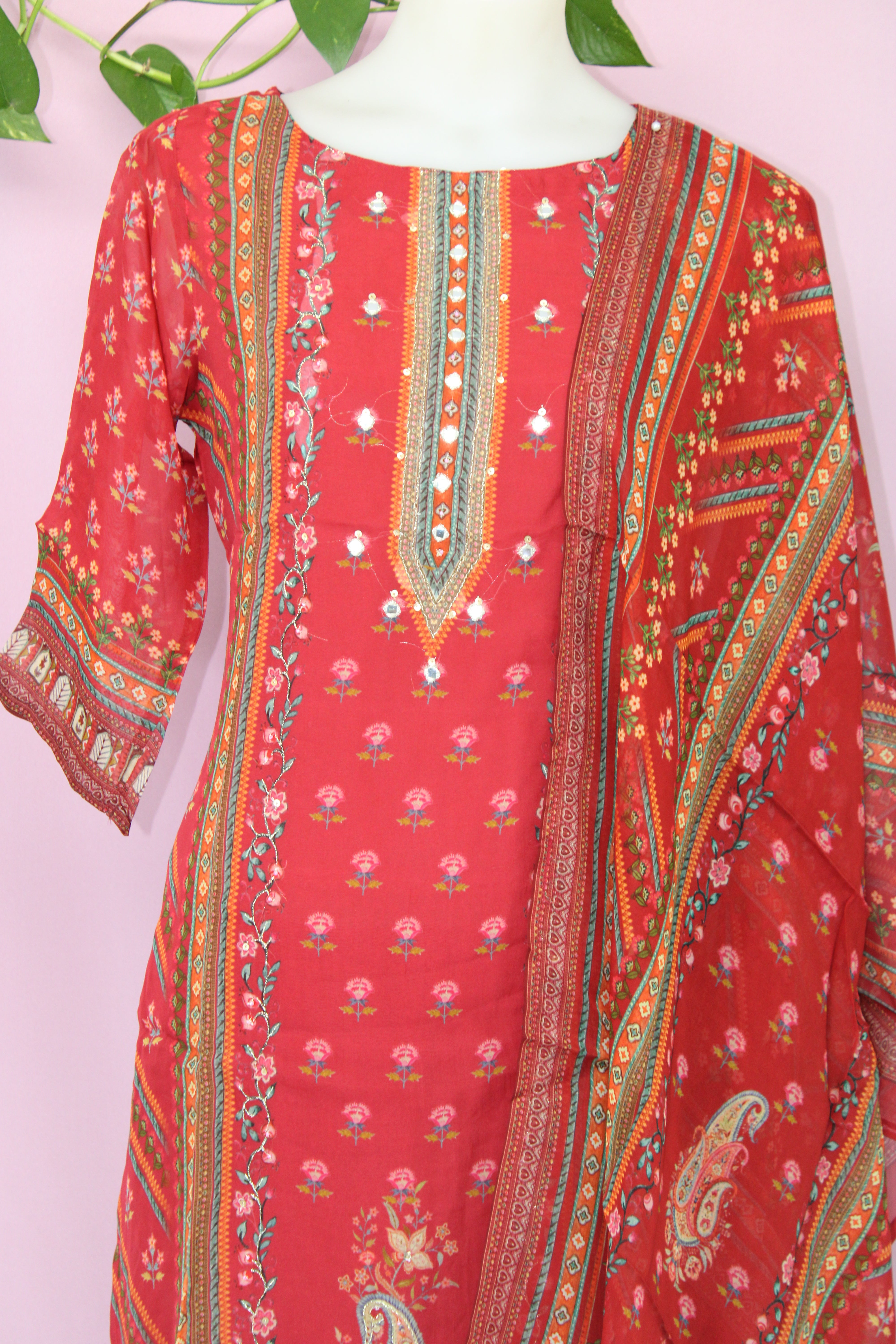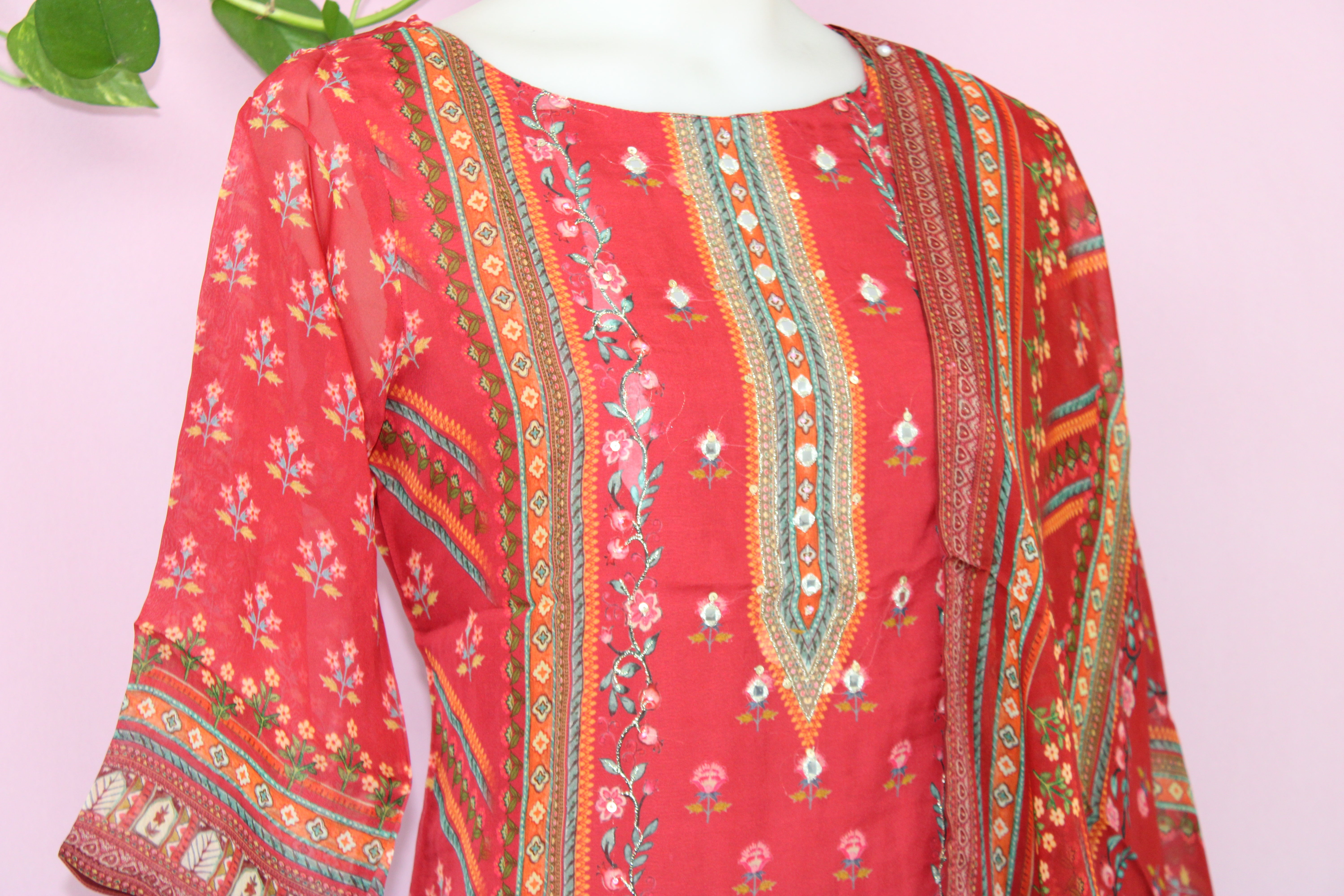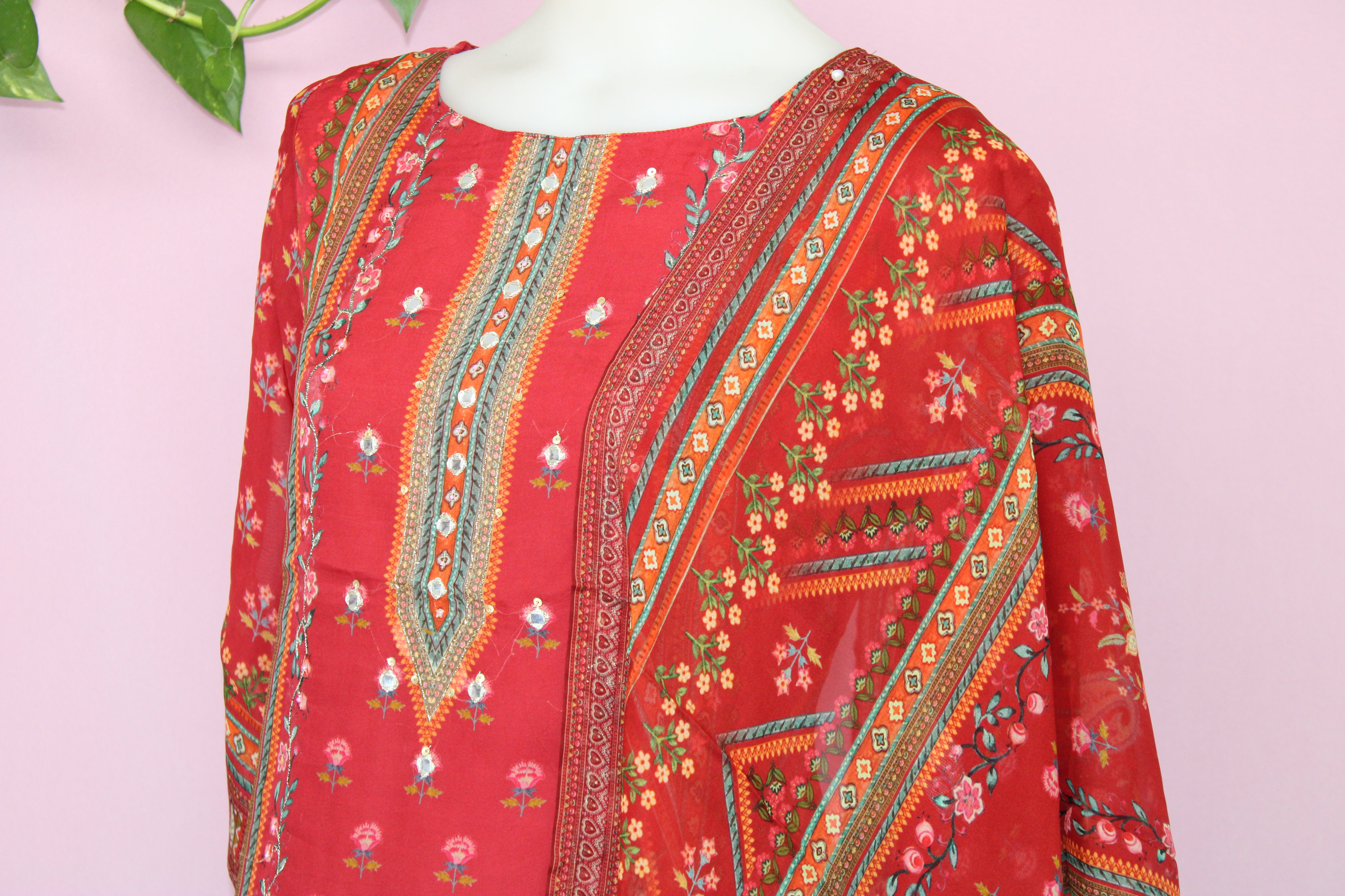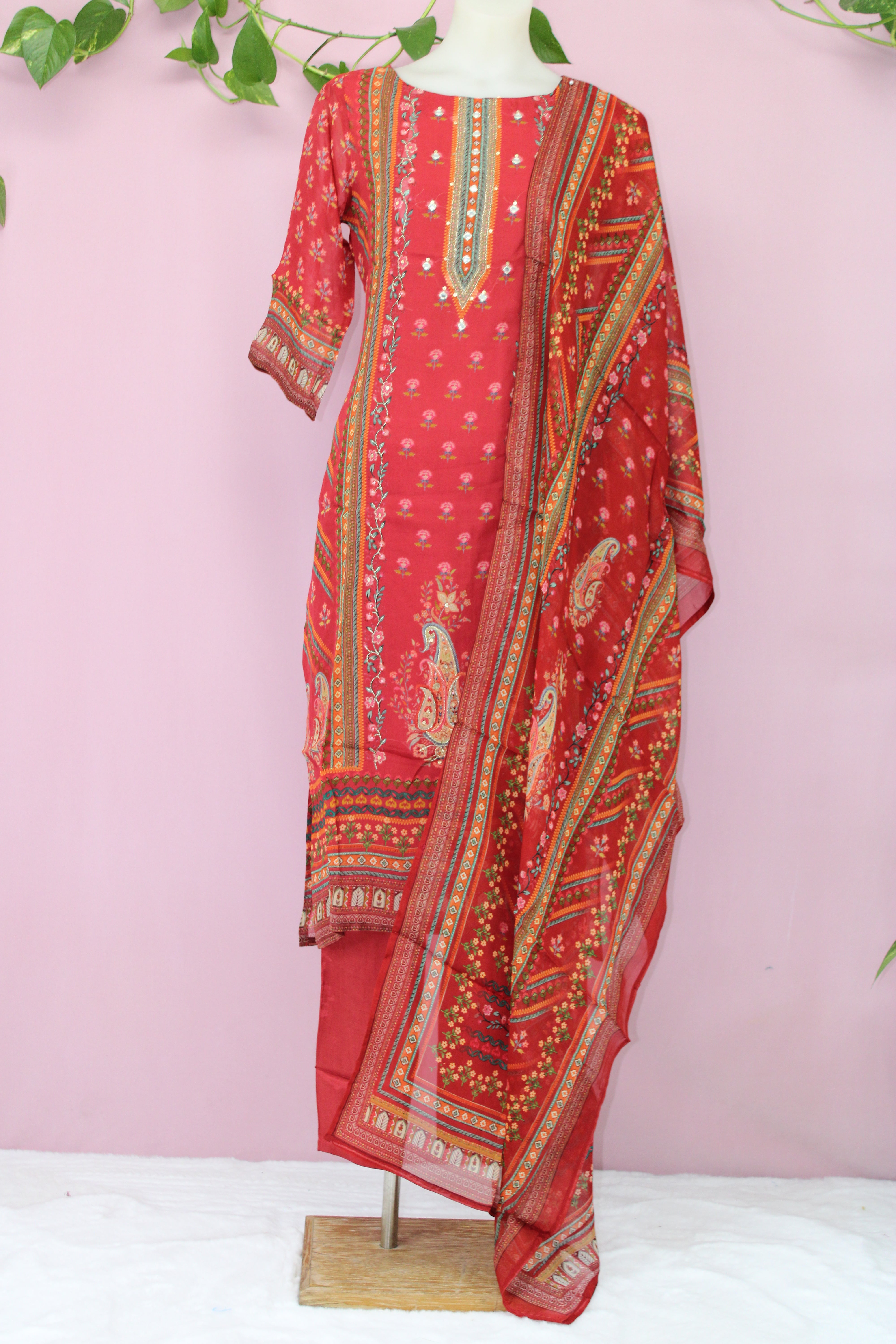 Step into elegance with this stunning ensemble crafted from pure organza, featuring a refined Pakistani digital print that exudes cultural richness and sophistication. The shirt is beautifully adorned with a combination of hand and machine embroidery, offering a perfect blend of artisanal detail and precision.