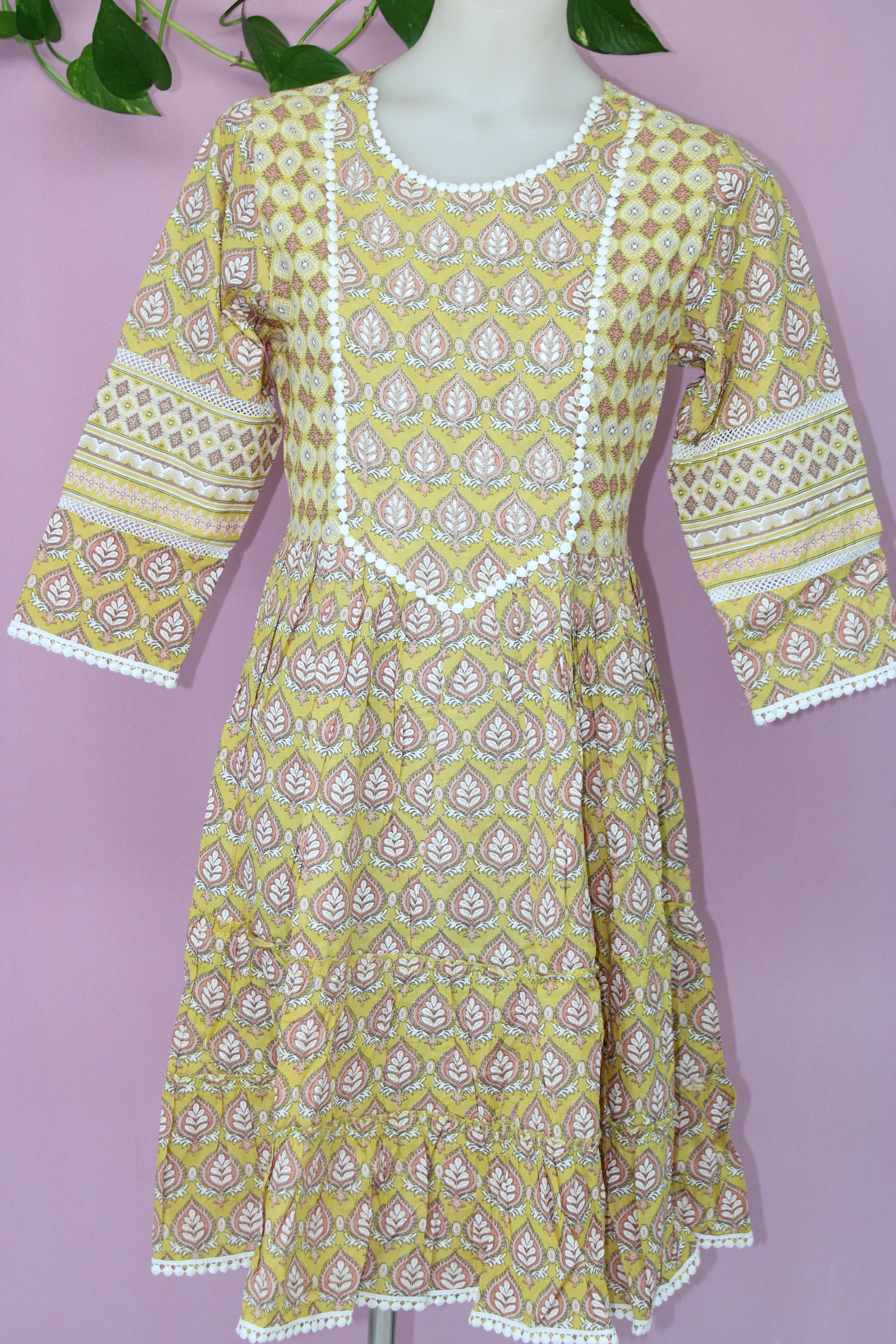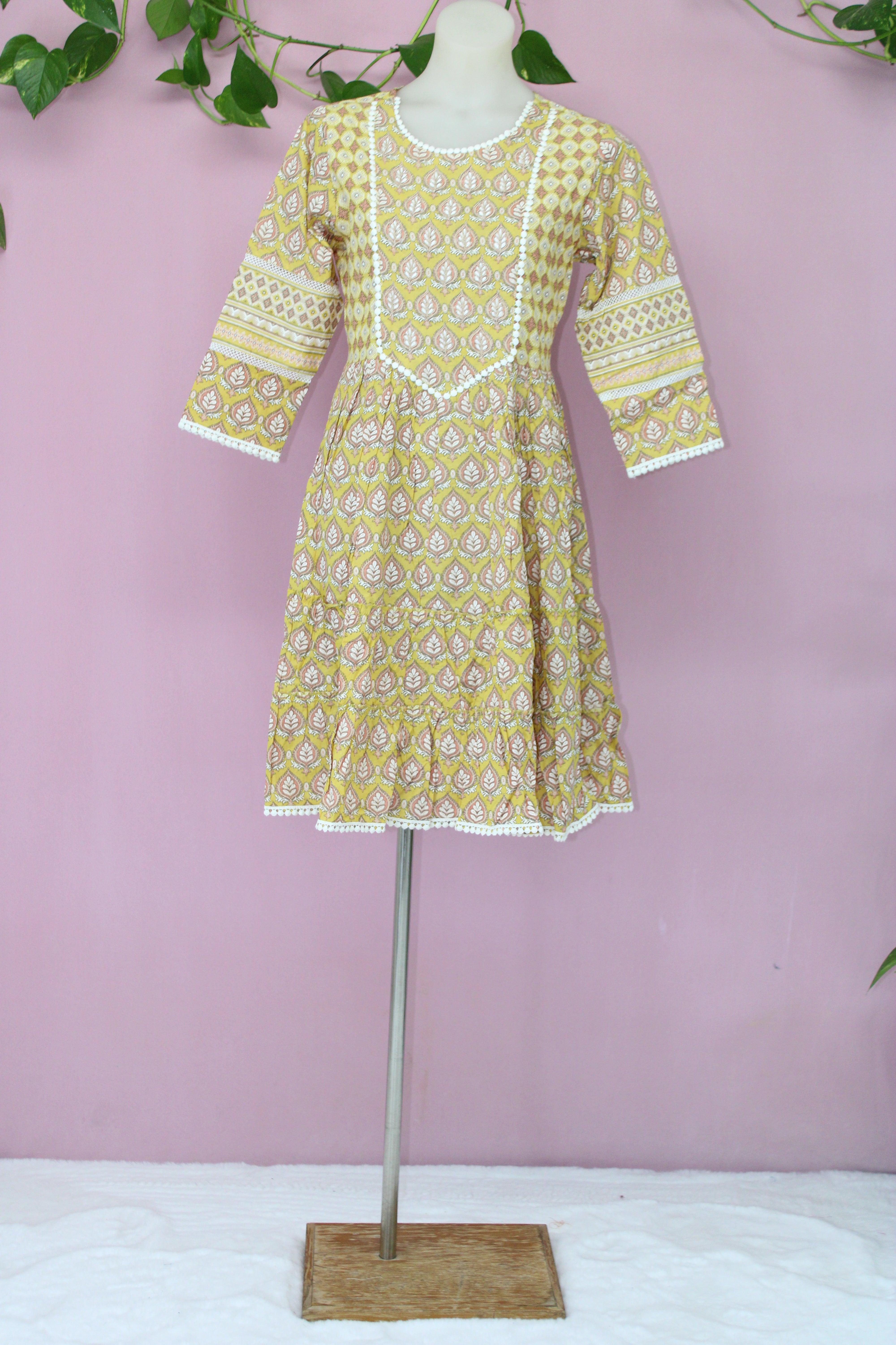 Embrace effortless charm with this beautifully crafted cotton layered dress, featuring traditional block printing that brings a timeless appeal. The dress is accented with intricate yoke embroidery, elegantly finished with delicate lace detailing.